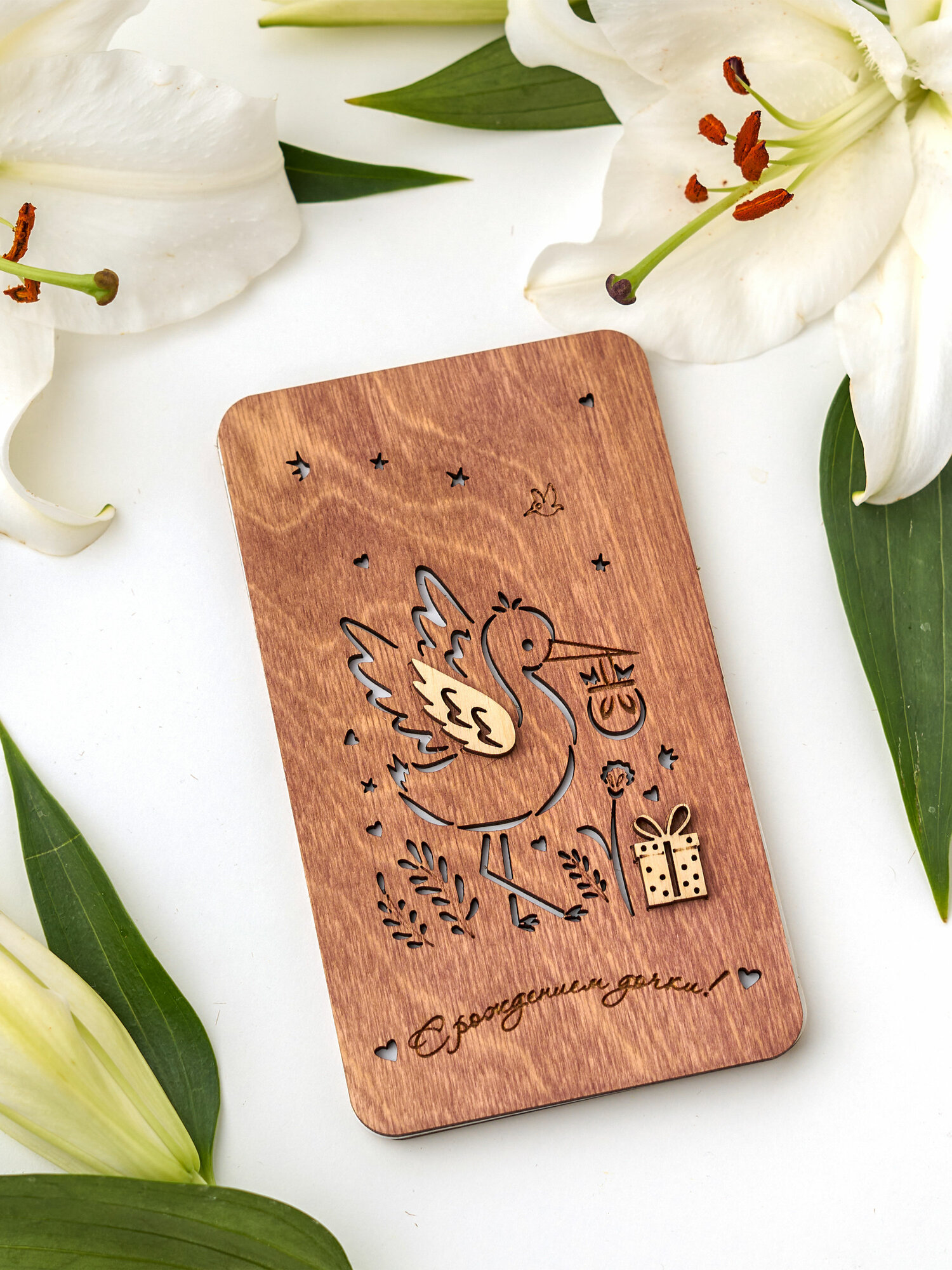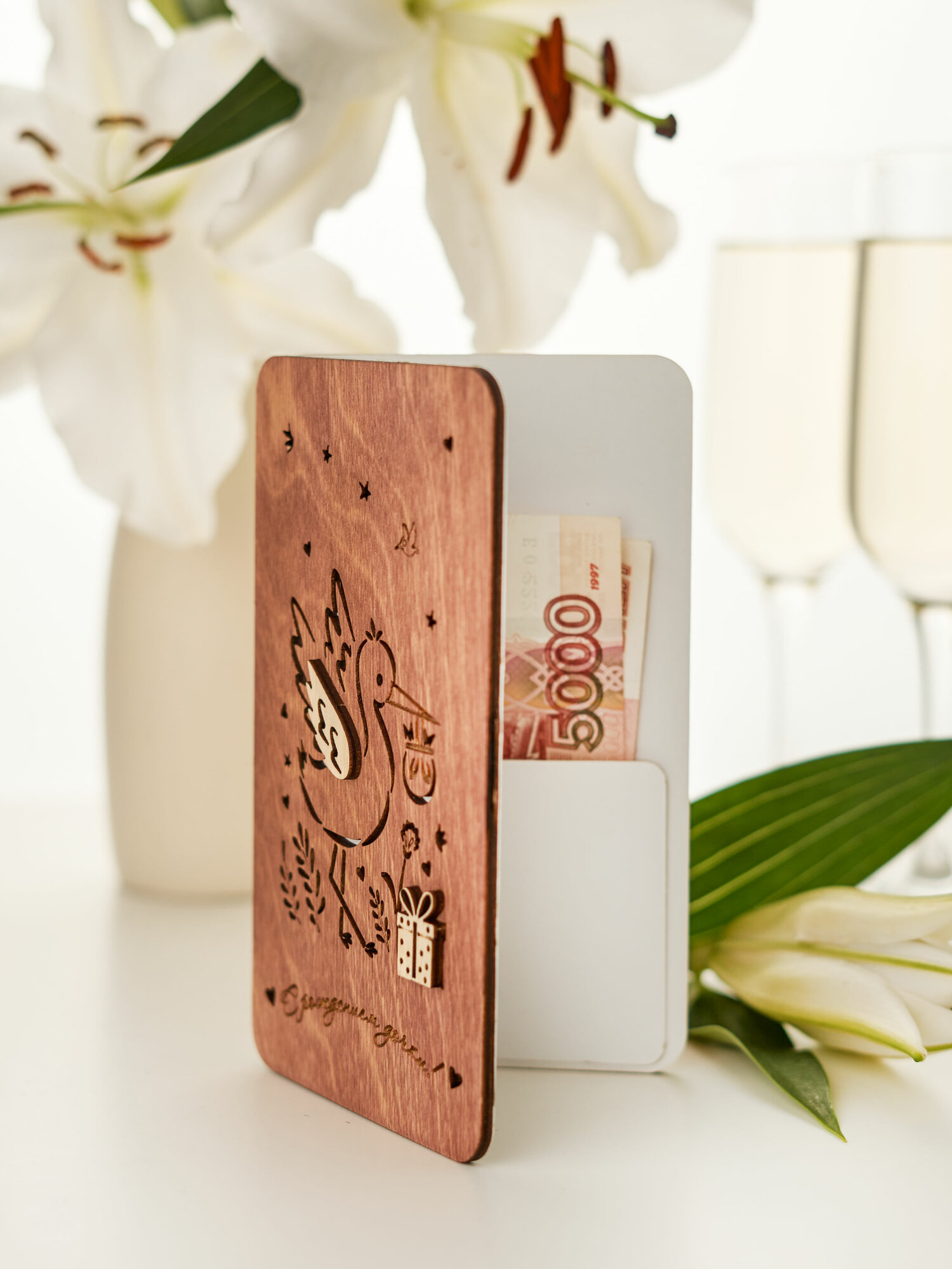 Конверт на рождение дочки "Аист" I Деревянная открытка для денег 510 ₽