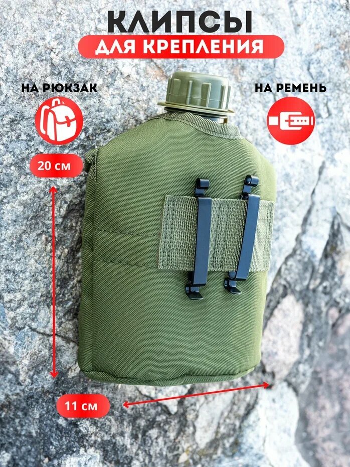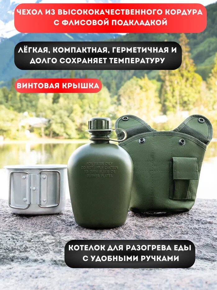 Фляжка армейская для воды с котелком,1литр,зеленый. Походная фляга для еды для охоты, рыбалки, похода и тактических маршрутов 1 089 ₽
