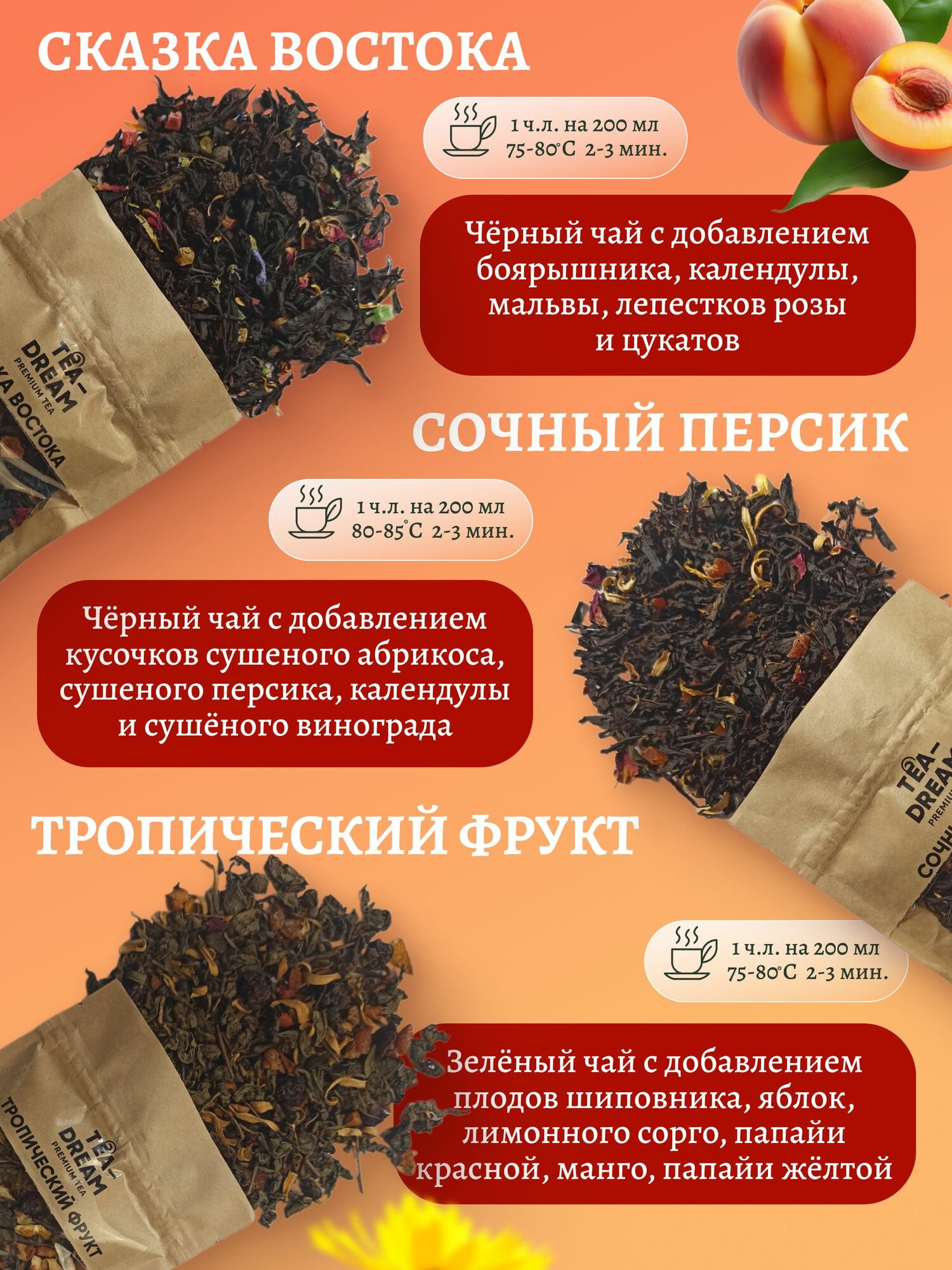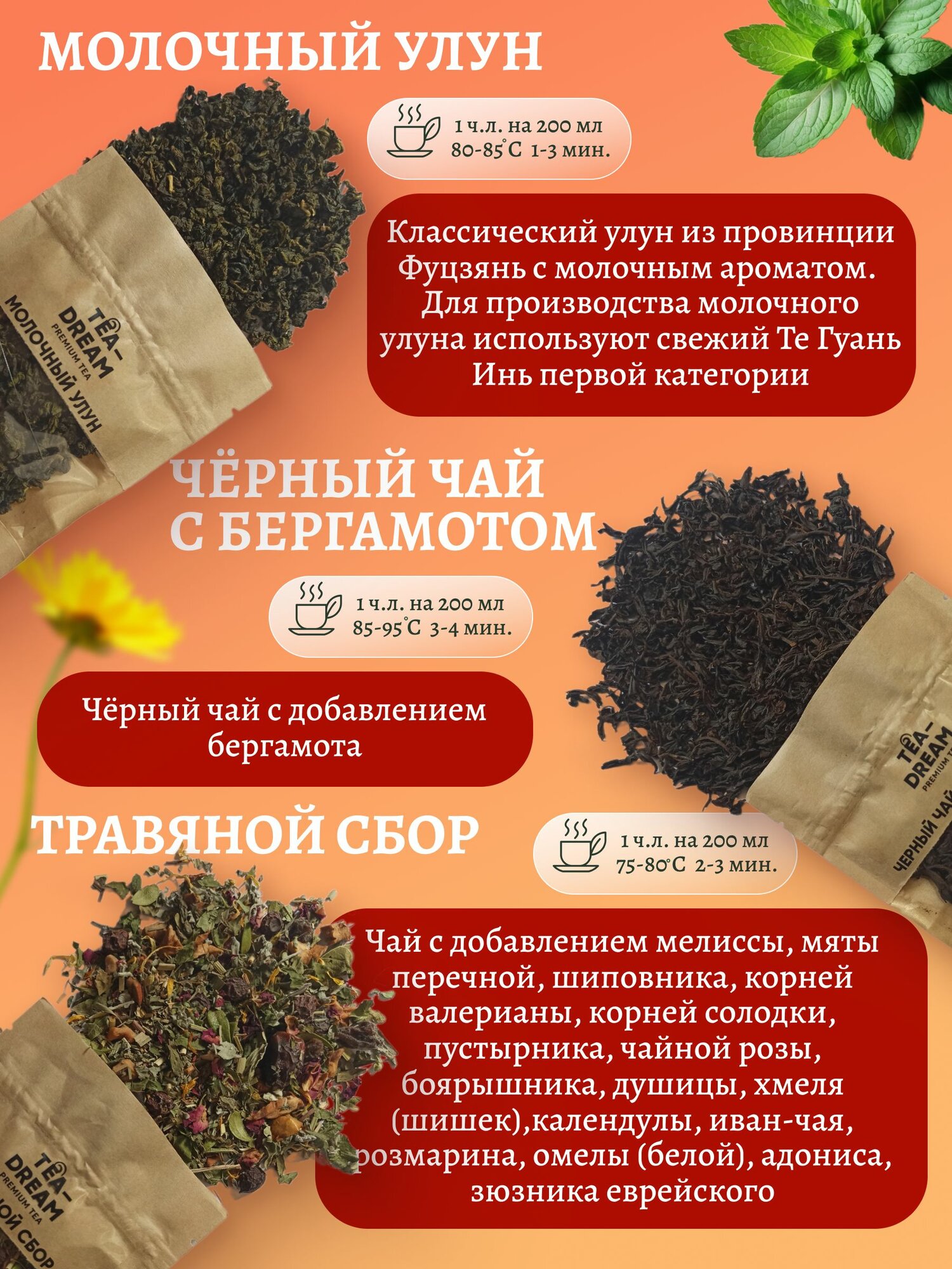 Состав | Чай; Улун; Молочный улун; чай с бергамотом; чай с чабрецом; с мятой; с ромашкой; с вишней; с лепестками роз; с манго; с клубникой; с апельсином; с ананасом; с мелиссой; с каркаде; с персиком; с айвой; с маракуйей; зеленый чай; черный чай |