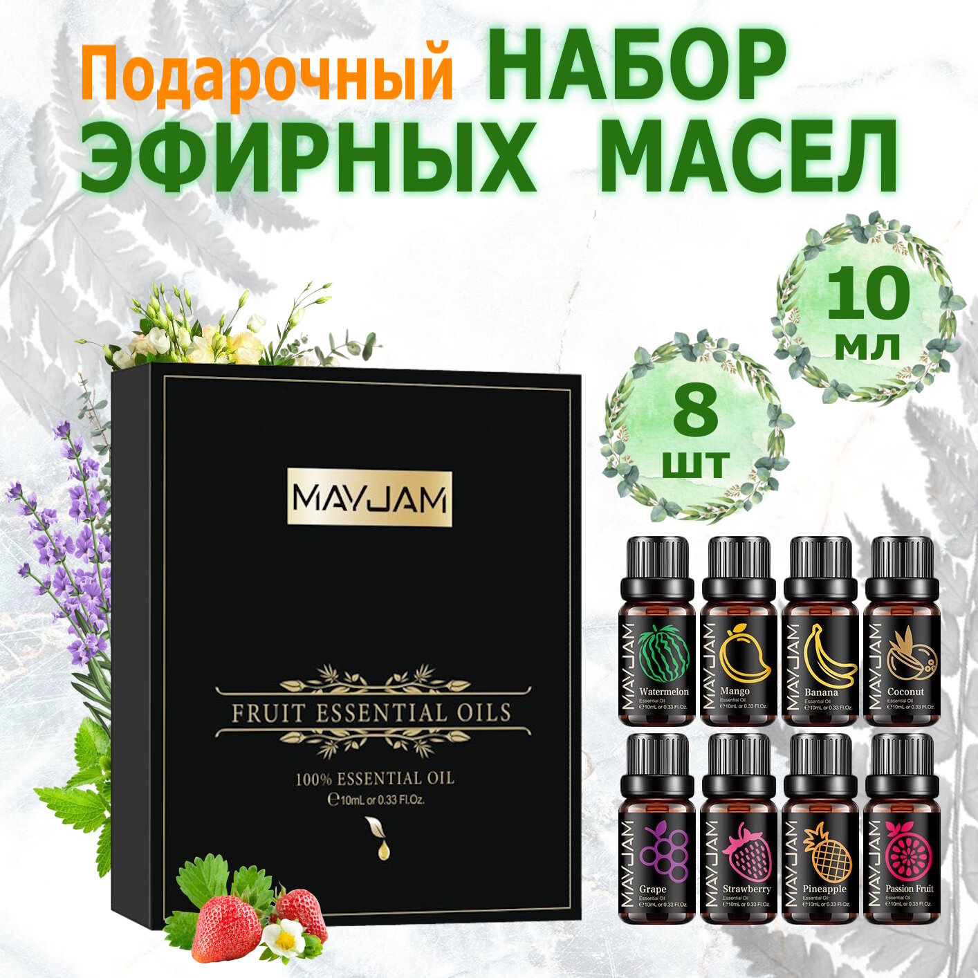 MAYJAM Подарочный набор Эфирных масел фрукты 8шт (10 мл) для увлажнителя воздуха, ароматерапии, массажа, лица и тела информация: