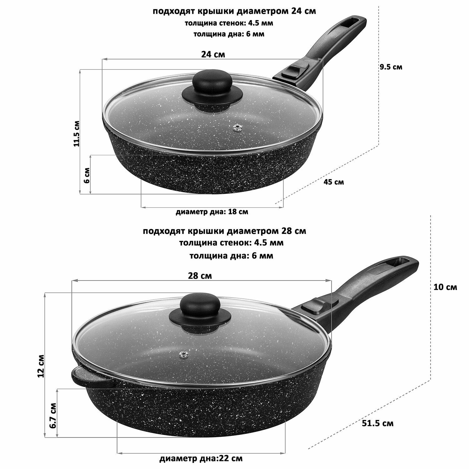 Набор 2 пр. Elan Gallery гармония вкуса Черный мрамор Сковороды 24 см, 28 см, с крышками, съемными ручками информация: