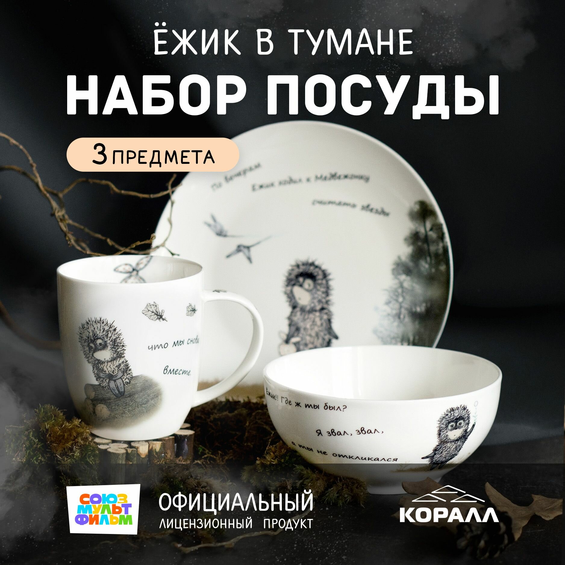 Набор посуды на 1 персону 3 предмета фарфор Ежик в тумане наб.№2. Коралл. информация: