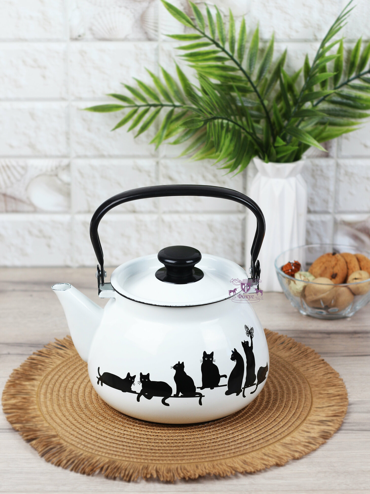 Чайник эмалированный 3 литра белый с рисунком Кошечки