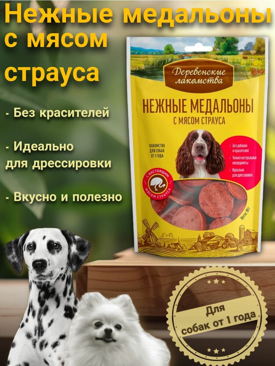 Лакомства для собак деревенские лакомства нежные медальоны с мясом страуса 90 г информация:
