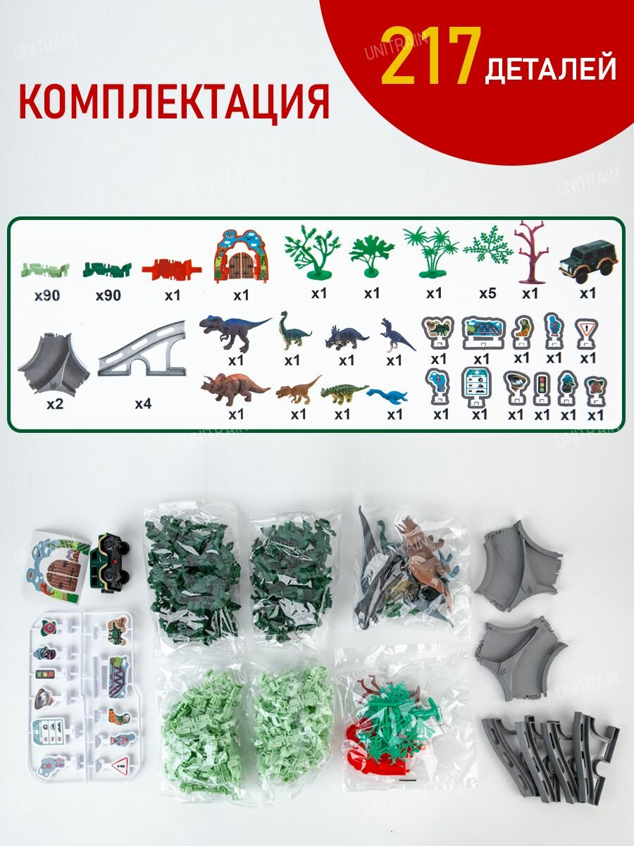 | Комплектация | 217 деталей: машинка с электромотором, 8 фигурок динозавров, 180 элементов для сборки трека, 4 элемента для моста, 1 ворота, 2 переводные стрелки, 11 дорожных знаков, элементы ландшафта. |