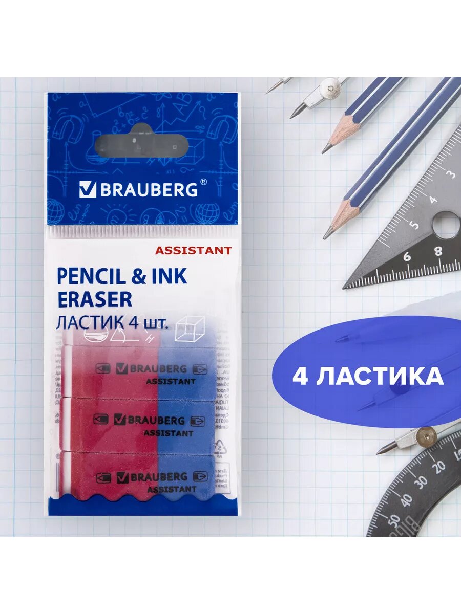 10 цен на Ластик Brauberg "Assistant 80", для карандашей и ручек, прямоугольный, ПВХ, красно-синий, 4 штуки