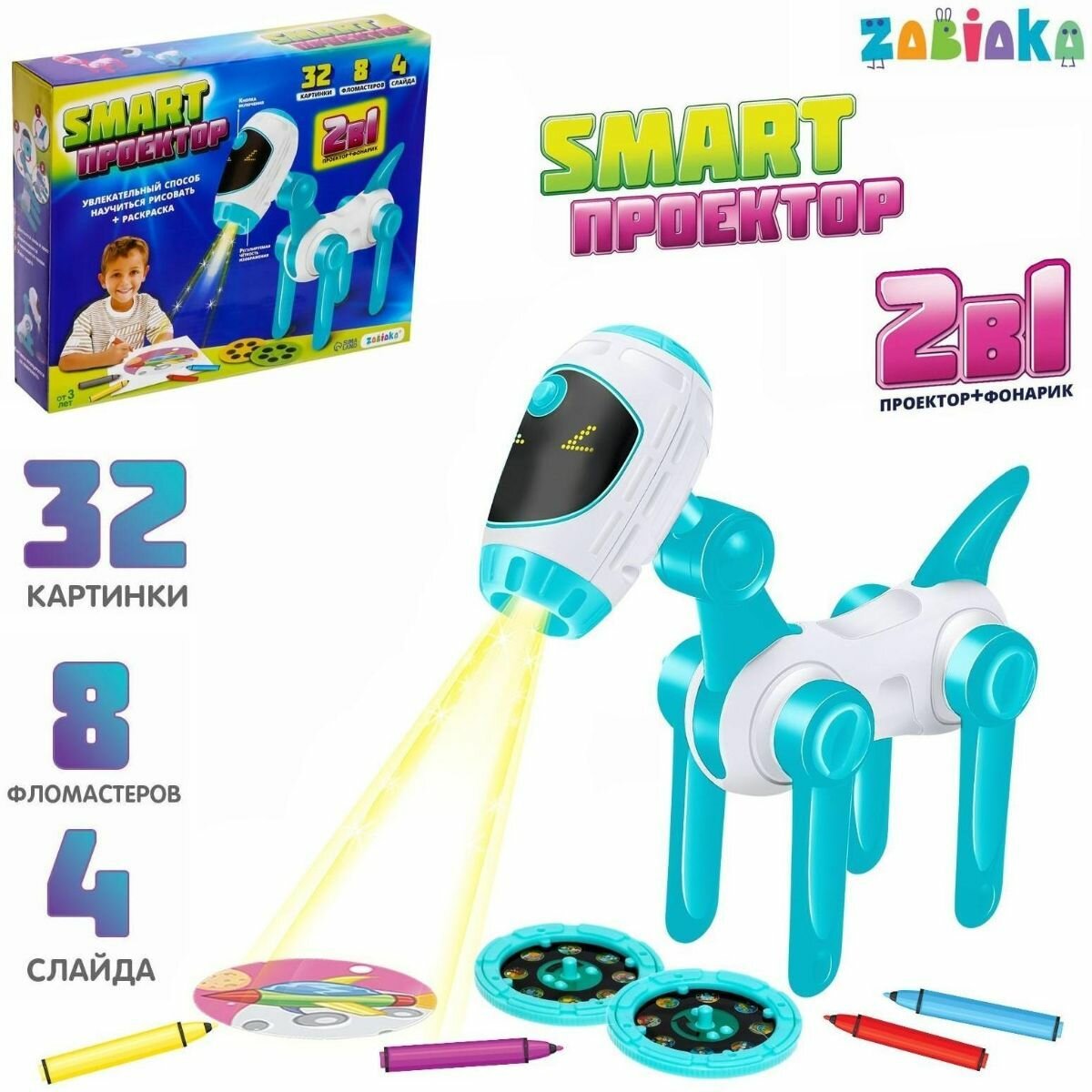 10 цен на Проектор-лампа для рисования Космическая собачка , 4 слайда, 32 картинки, 8 фломастеров, микс