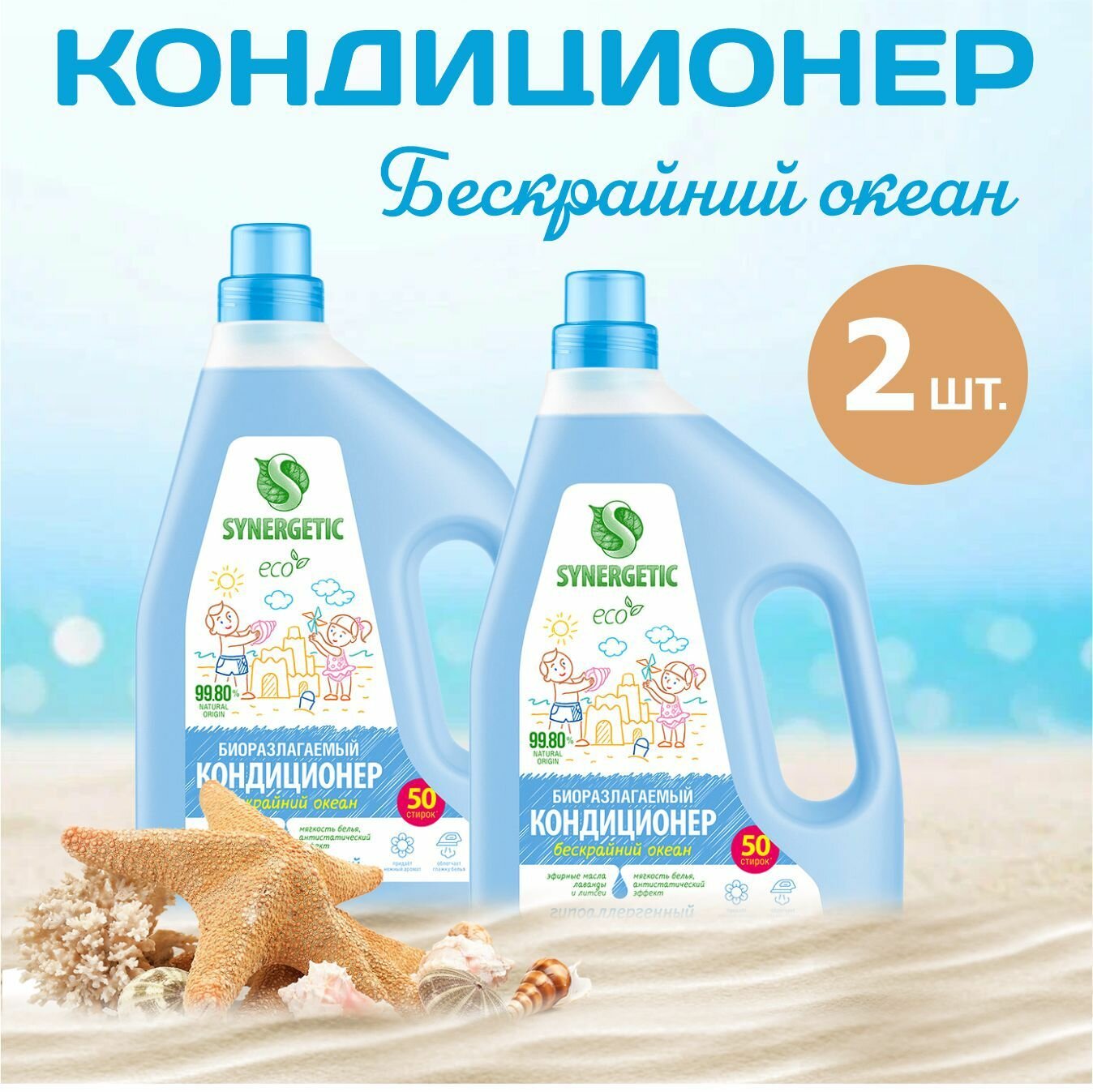 Synergetic Кондиционер-ополаскиватель для белья, 2 штуки, бескрайний океан, 1,5 л, 50 стирок 4086 информация: