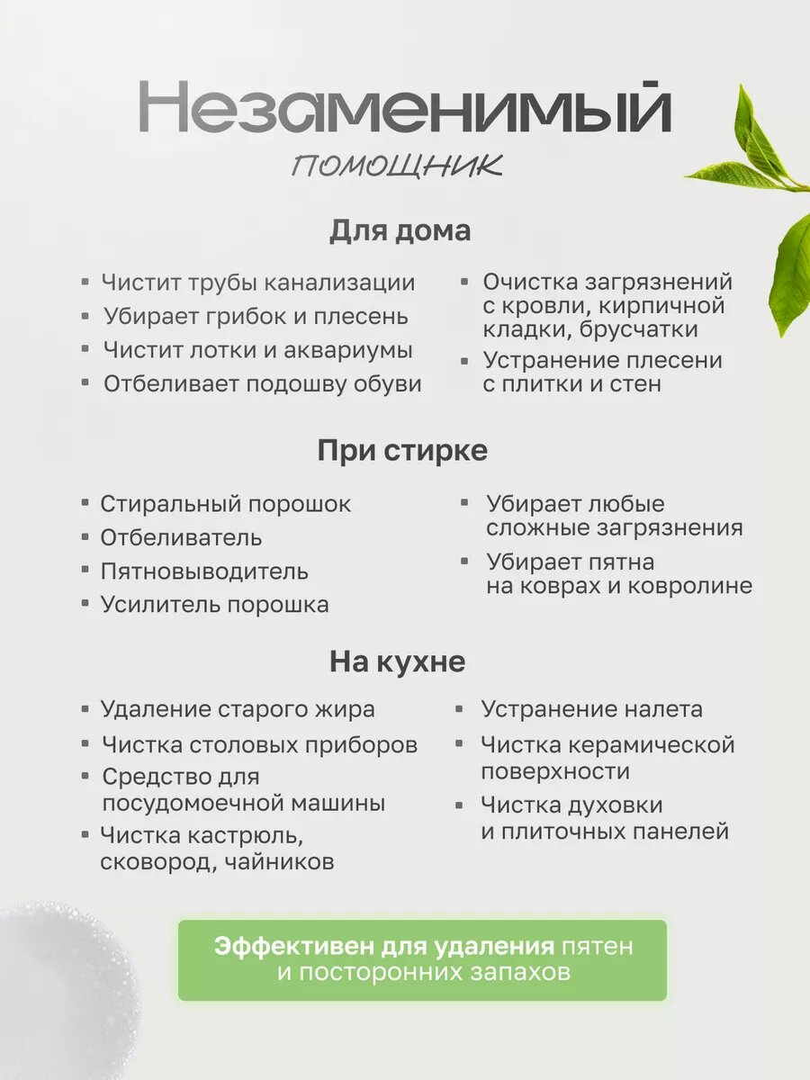 | Эффект | антибактериальный / выведение пятен / защита от плесени / обезжиривание / от запаха домашних животных / отбеливание / придание блеска / противоаллергенный / удаление накипи / устранение засоров / устранение застарелого жира / устранение нагара / устранение накипи / устранение неприятных запахов / устранение плесени / устранение ржавчины |