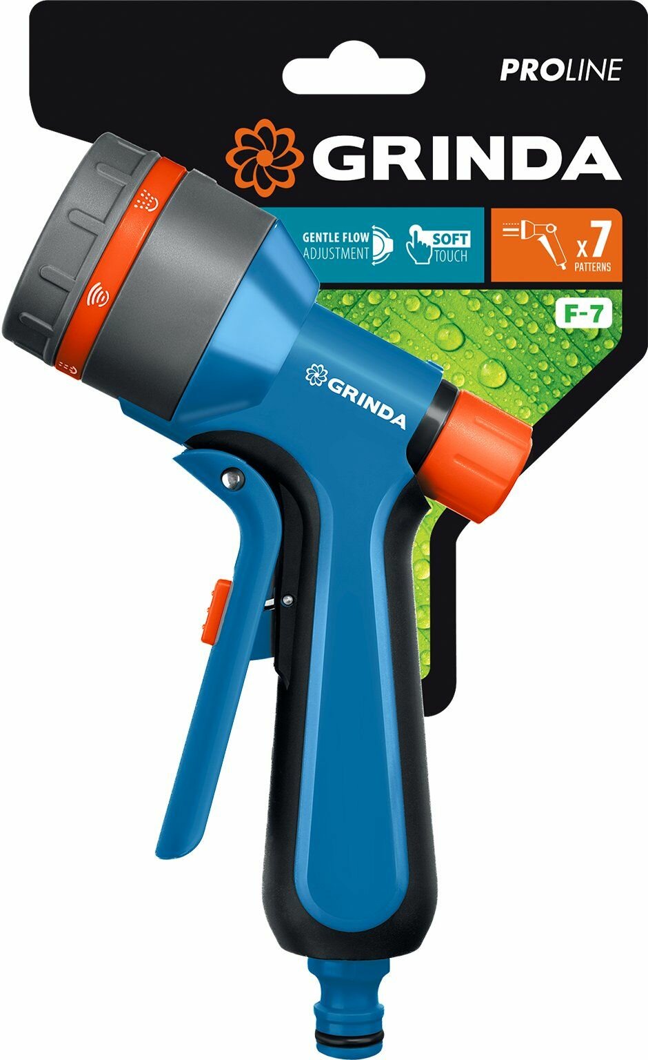 Поливочный пистолет GRINDA PROLine F-7 7 режимов, курок спереди, двухкомпонентный с регулятором напора