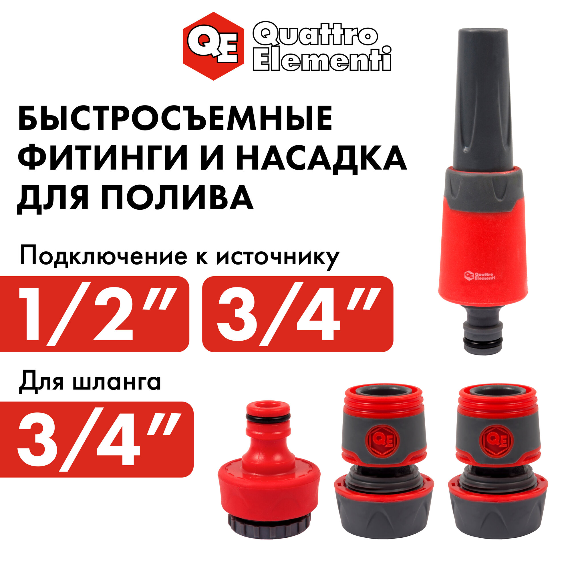 Набор поливочный QUATTRO ELEMENTI 4 предмета. Соединитель 3/4"-2шт., штуцер 1/2" и 3/4", насадка 646 информация: