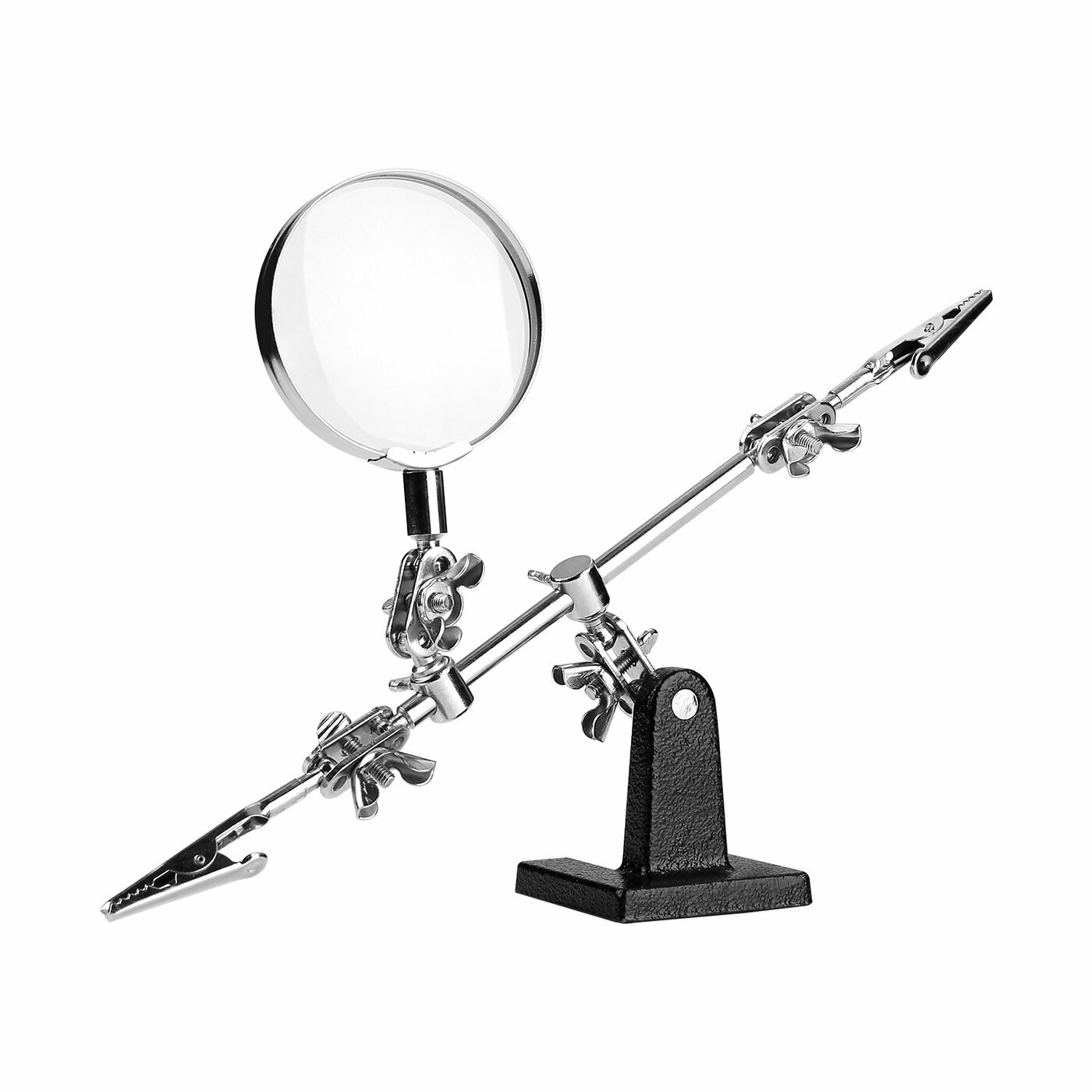 | Дополнительная информация | Держатель прецизионный с зажимами и лупой сочетает в себе 2 зажима типа "крокодил" и лупу, что позволяет закреплять необходимые детали и производить их 2,5-кратное увеличение. Положение и поворот линзы можно регулировать. Диаметр линзы - 62мм. |