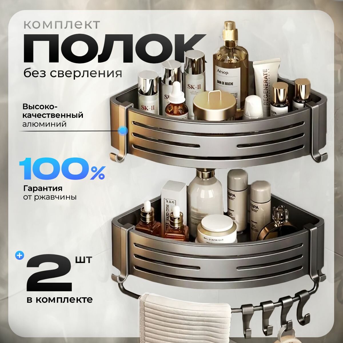 10 цен на Полка для ванной комнаты угловая самоклеющаяся без сверления / Подвесной органайзер с крючками для душевой кабины, туалета, кухни / Подставка настенная металлическая на липучках, серая, 2 шт