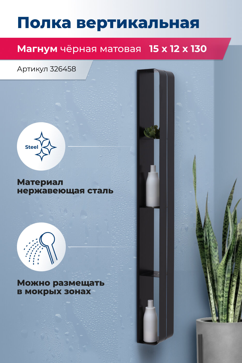 Полка Aquanet Магнум H 15x130 черная матовая, вертикальная информация: