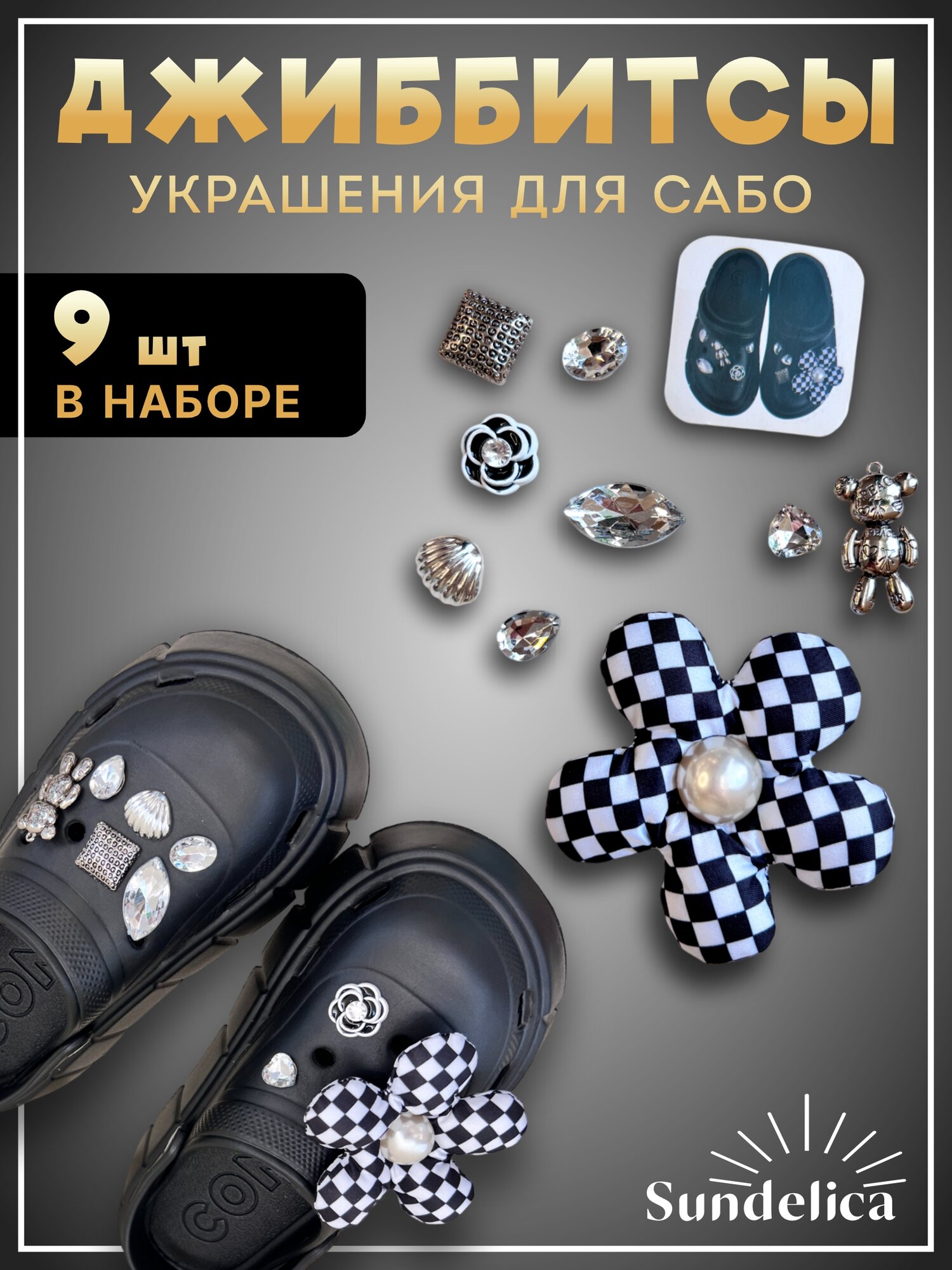 10 цен на Джибитсы Sundelica набор, украшение для обуви, черно-белый в клеточку цветок
