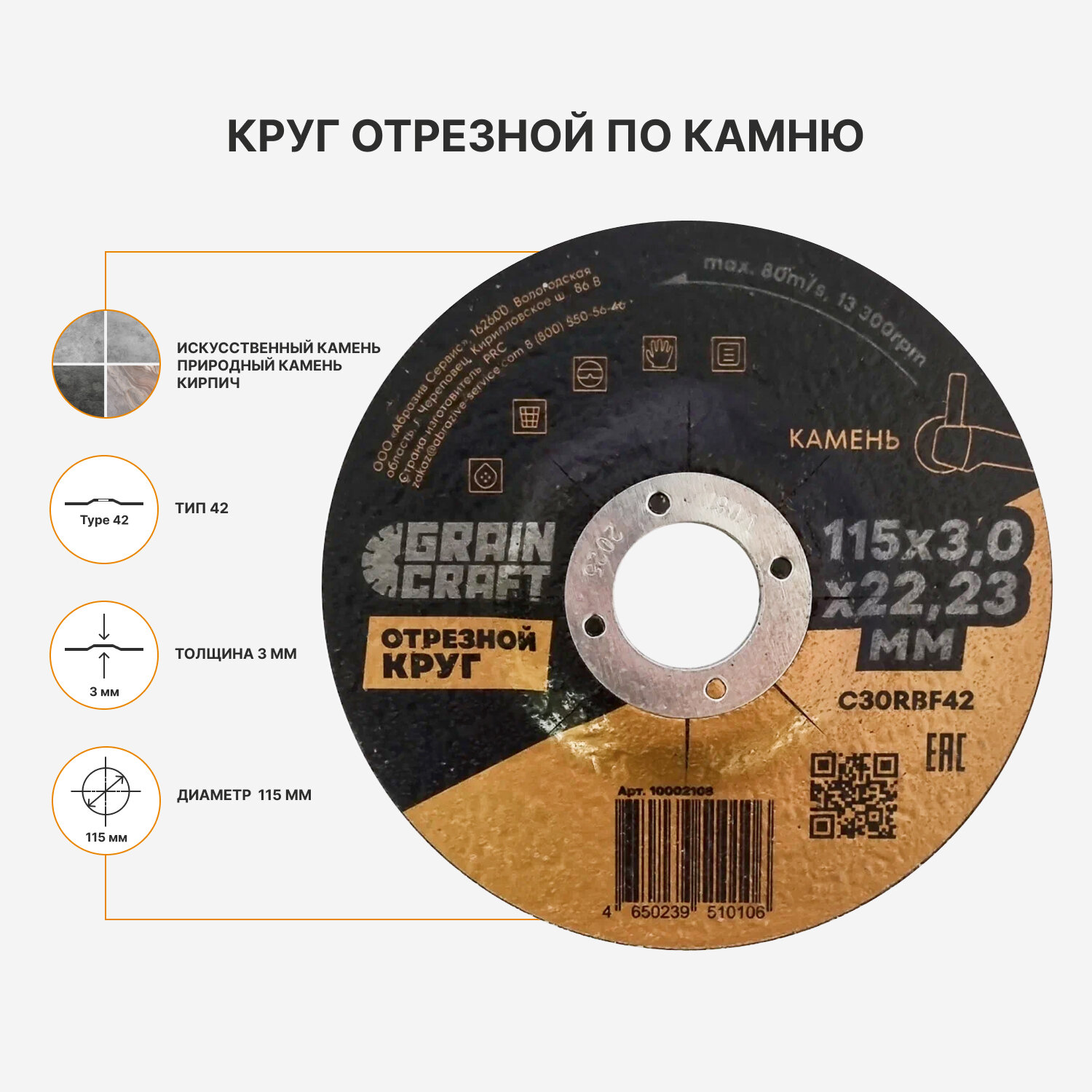 Отрезной круг GRAINCRAFT тип 42, по камню, размер 115x3x22.23 мм информация: