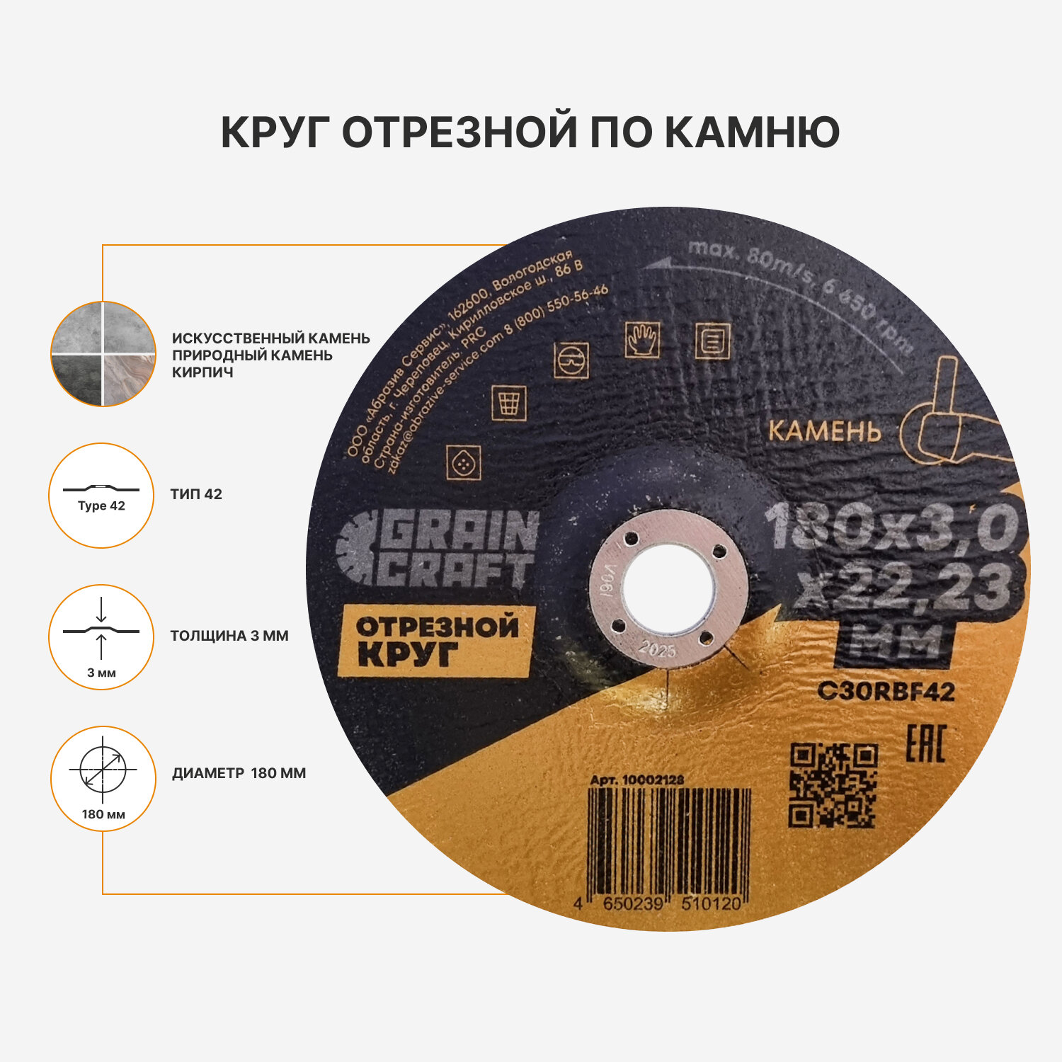 Отрезной круг GRAINCRAFT тип 42, по камню, размер 180x3x22.23 мм информация: