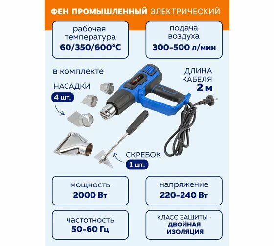 Фен Промышленный Электрический С Дисплеем И Насадками (220в,50/60гц, 2000вт, 60-600градс, 300-500л/Мин, Класс Защиты-Двойная .