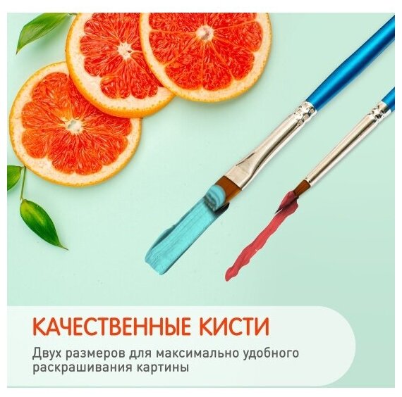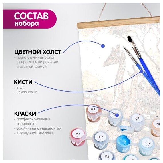 | Комплектация | подготовленный холст с деревянными рейками и шнуром, нейлоновые деревянные кисти разного размера, 3 шт., профессиональные акриловые краски, устойчивые к выцветанию, контрольный лист можно скачать на сайте производителя, указанном на упаковке. |