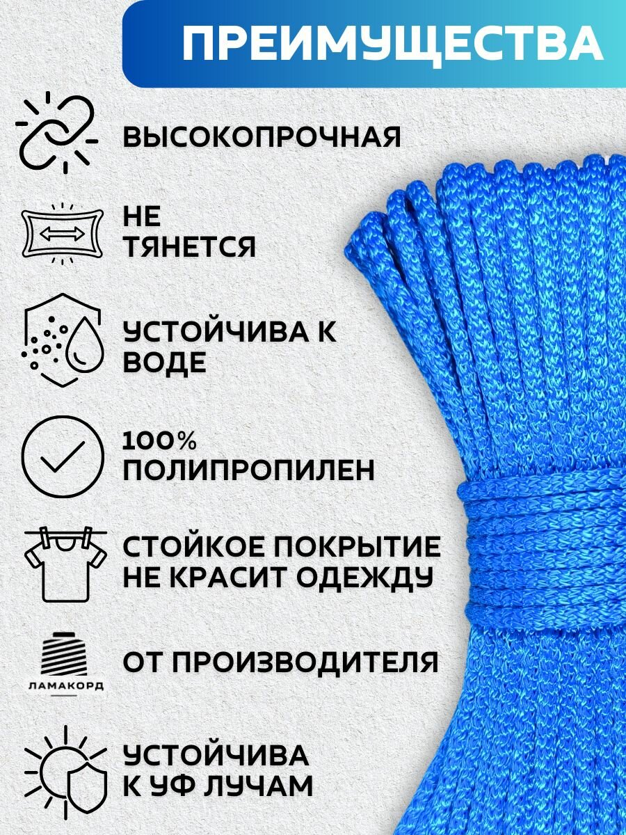 Отзывы на Веревка бельевая 4 мм 50 м синяя. Шнур бельевой вязаный полипропиленовый с сердечником