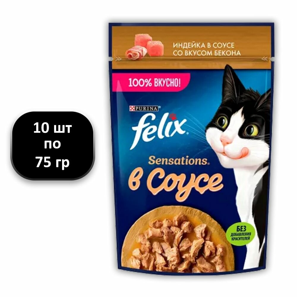 10 цен на FELIX SENSATIONS для взрослых кошек с индейкой в соусе со вкусом бекона пауч 75 гр х 10 шт