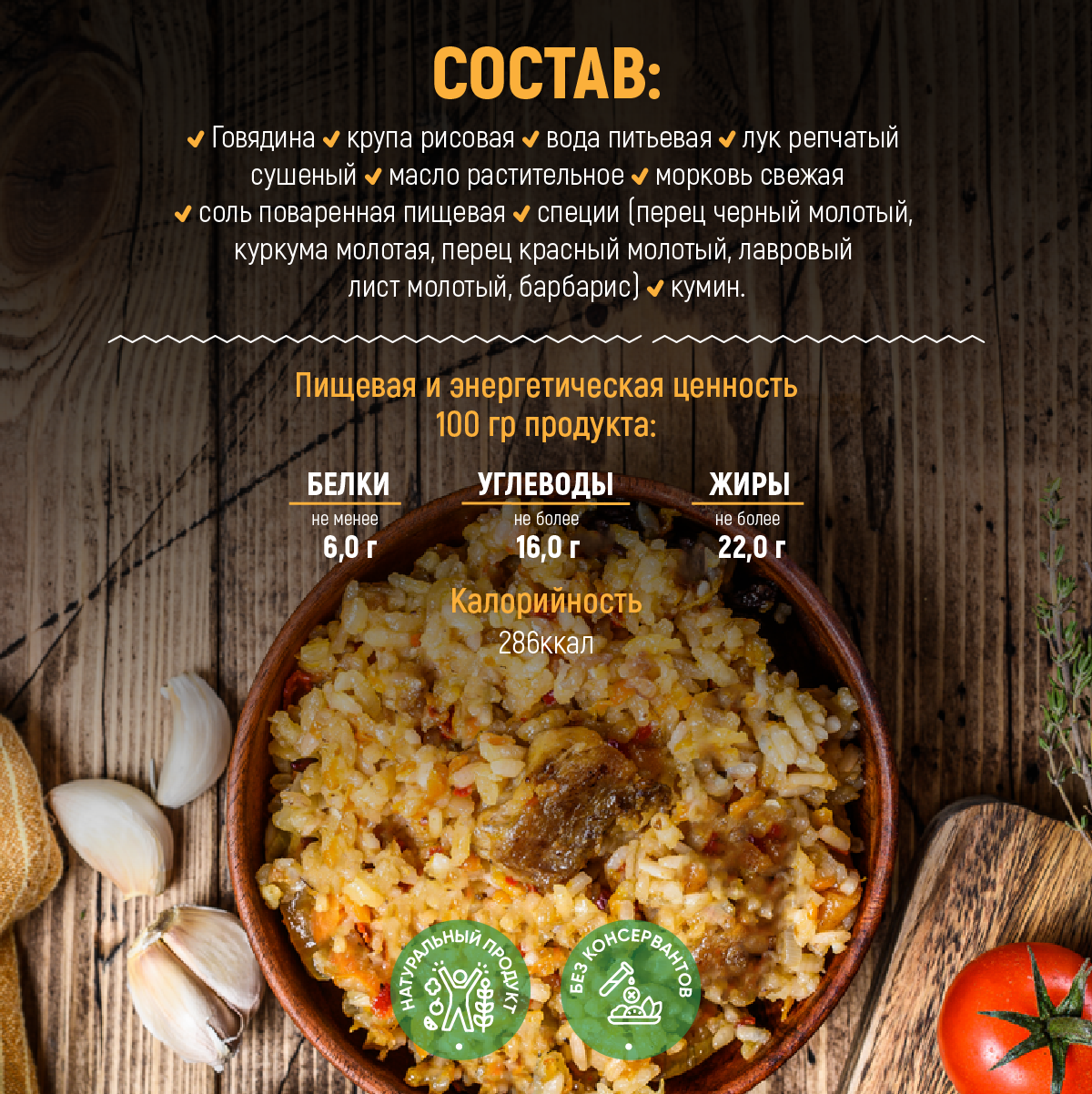 | Состав | Говядина, крупа рисовая, вода питьевая, лук репчатый сушеный, масло растительное, морковь свежая, соль поваренная пищевая, специи (перец черный молотый, куркума молотая, перец красный молотый, лавровый лист молотый, барбарис),кумин |