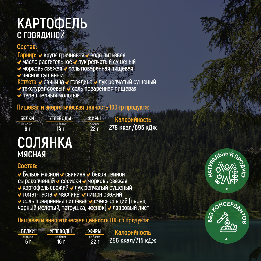 | Состав | Борщ 300 г, Солянка 300 г, Щи со свининой 300 г, Суп куриный по-домашнему 300 г |