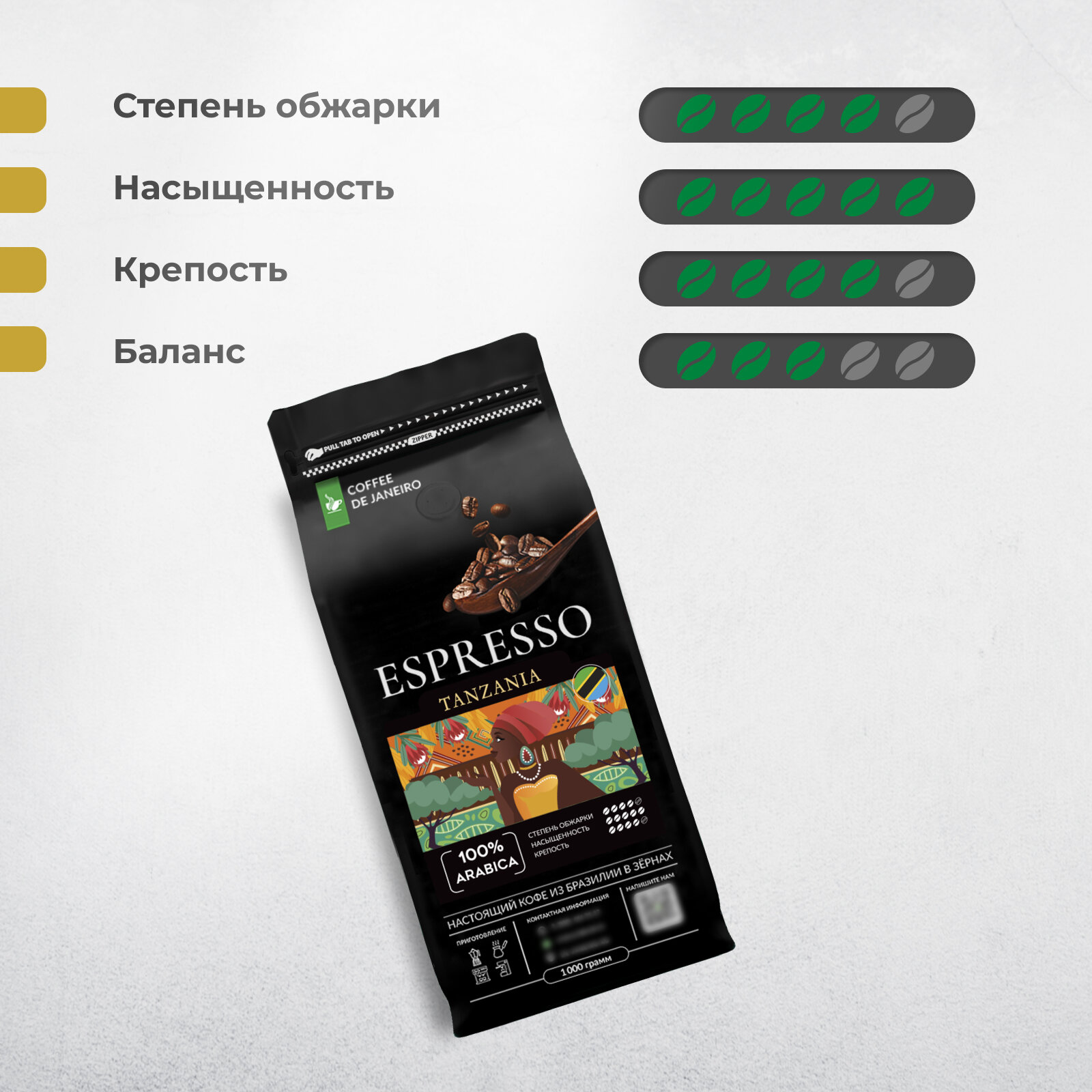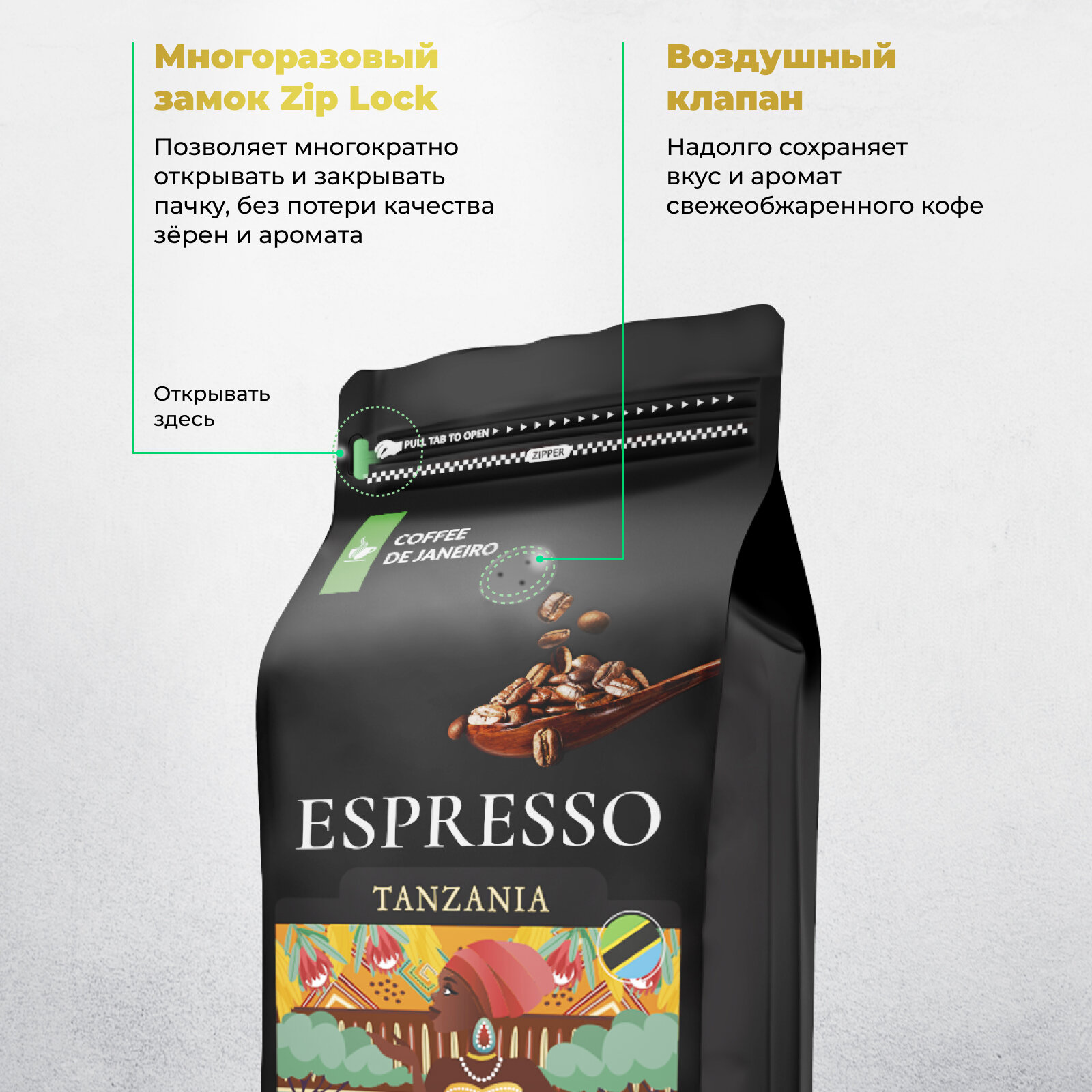 Кофе в зернах 1кг DE JANEIRO (ДЕ жанейро) ESPRESSO TANZANIA, 100% Арабика, в упаковке Zip-Lock, кофе зерновой информация: