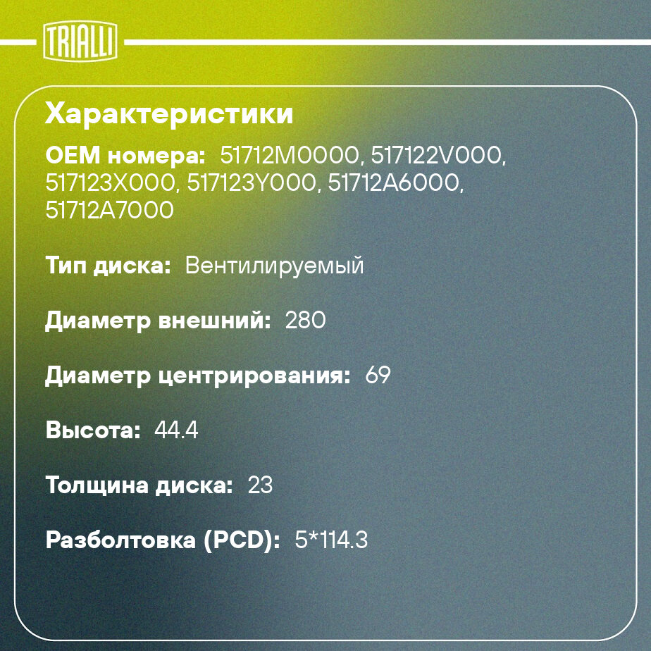 Диск тормозной для автомобилей Hyundai Creta (16-) 1.6 передний d=280 DF 084713 TRIALLI информация: