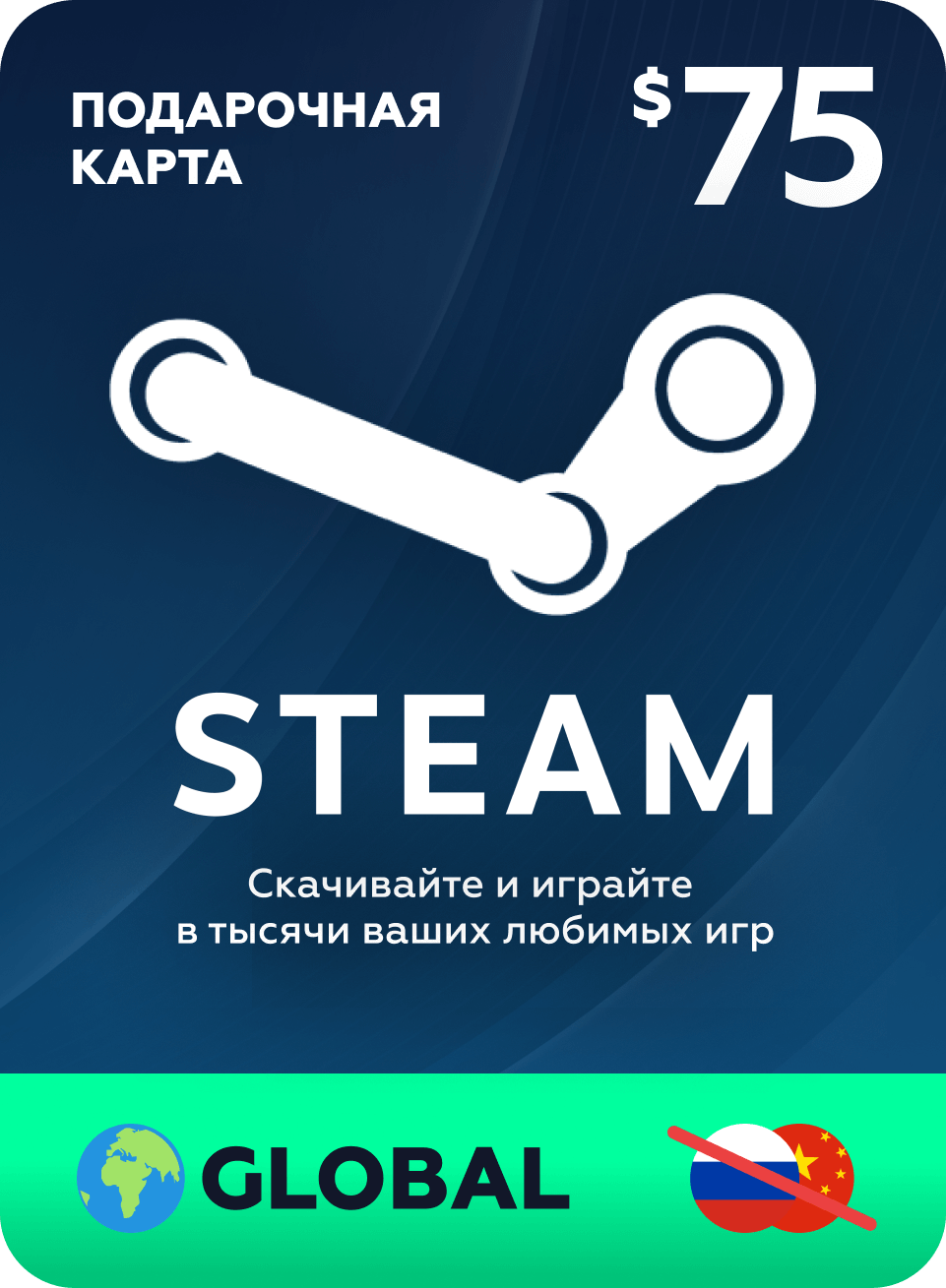 Пополнение кошелька Steam на 75 USD / Gift Card $75 Global (Глобальный ключ активации) / не подходит для России и Китая информация: