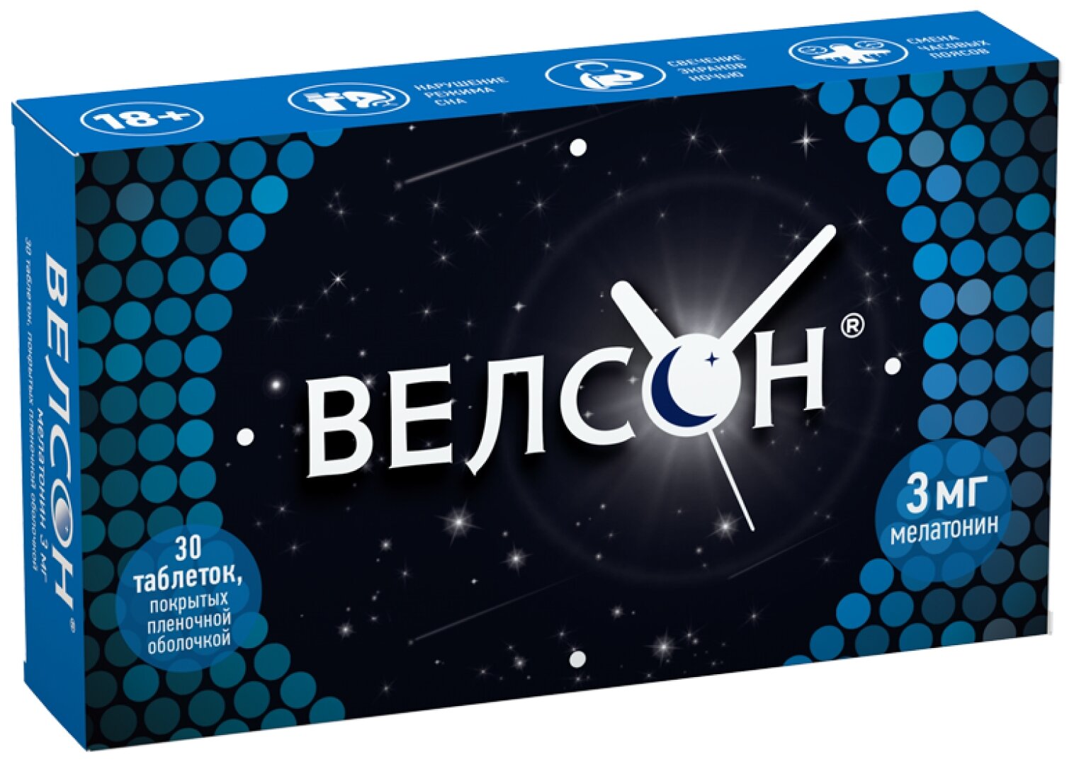 | Особые указания | В период применения препарата Велсон рекомендуется избегать пребывания на ярком свету.Необходимо проинформировать женщин, желающих забеременеть, о наличии у препарата слабого контрацептивного действия.Отсутствуют клинические данные о применении мелатонина у пациентов с аутоиммунными заболеваниями, в связи с чем, применение у данной категории пациентов не рекомендуется. Препарат Велсон нужно применять с осторожностью пациентам с различной степенью почечной недостаточности. |