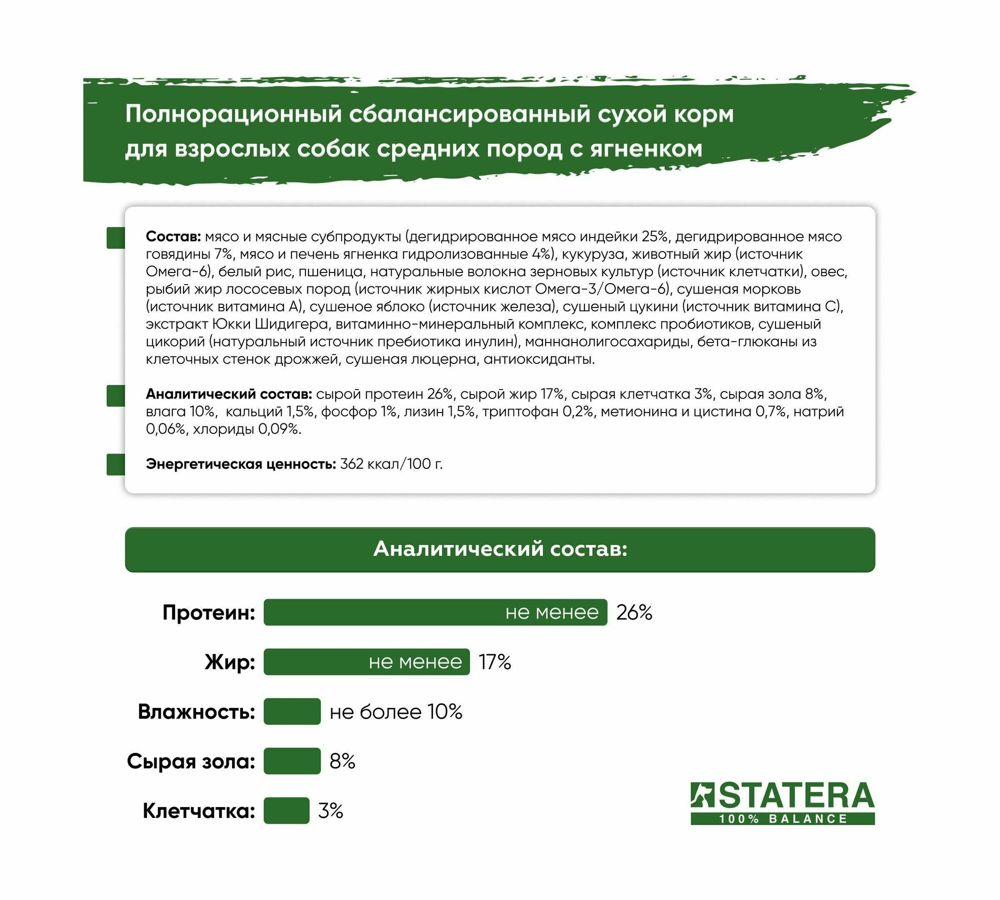 Statera - Сухой корм для взрослых собак средних пород, с Ягненком, 18 кг информация: