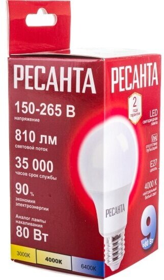 10 цен на Светодиодная лампа Ресанта LL-R-A60-9W-230-4K-E27 (груша, 9Вт, нейтр, Е27), 76/1/14