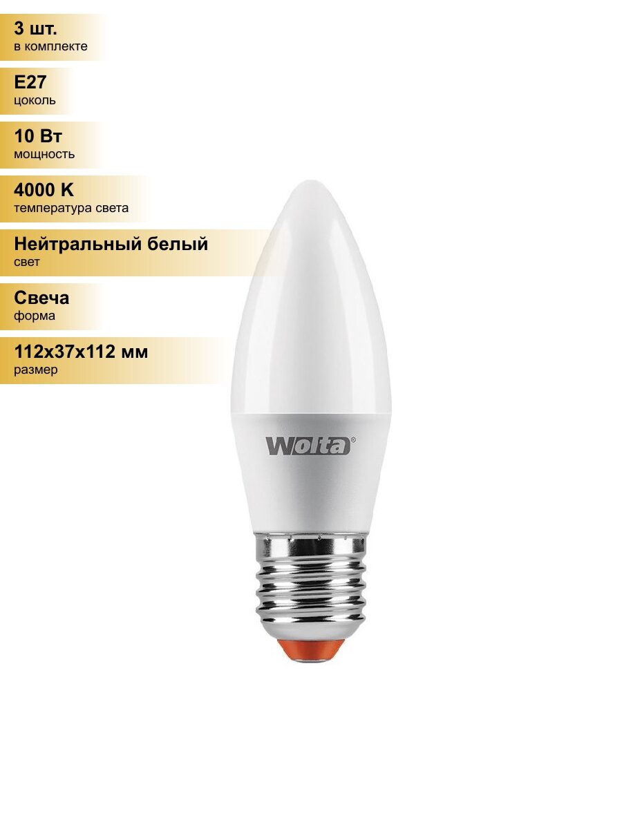 (3 шт.) Светодиодная лампочка Wolta лампа св/д свеча C37 E27 10W(900Lm) 4000K 4K 4K 112X37 25SC10E27 Нейтральный белый. Цоколь E27 информация:
