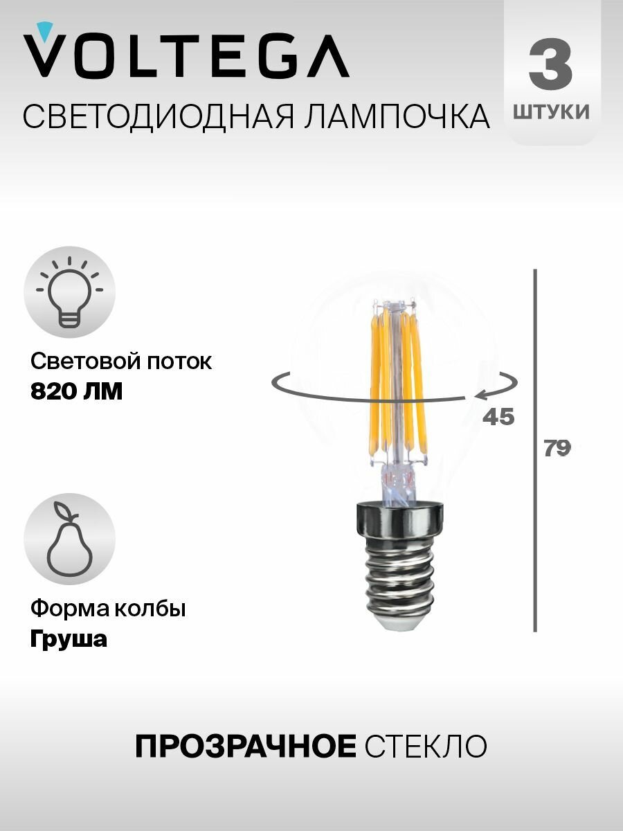 Лампочка светодиодная E14 форма груши 9W теплый свет Voltega Crystal Graphene Globe 2800K упаковка 3 штуки 684 ₽