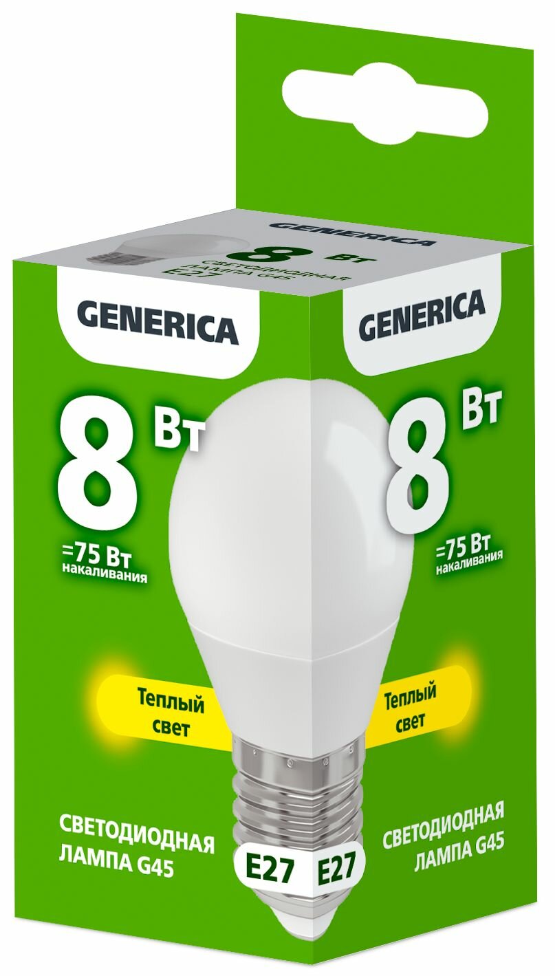Лампочка светодиодная G45 шар, 8 Вт, 230В, 3000К, E27, GENERICA информация: