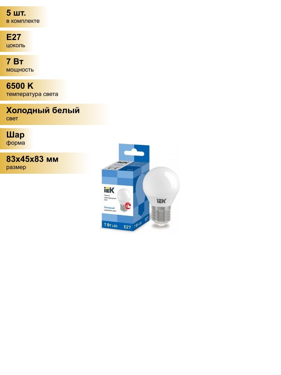 (5 шт.) Светодиодная лампочка IEK шар G45 E27 7W(630lm) 6500К 6K 83х45 матов. ECO LLE-G45-7-230-65-E27 Холодный белый. Цоколь E27 информация: