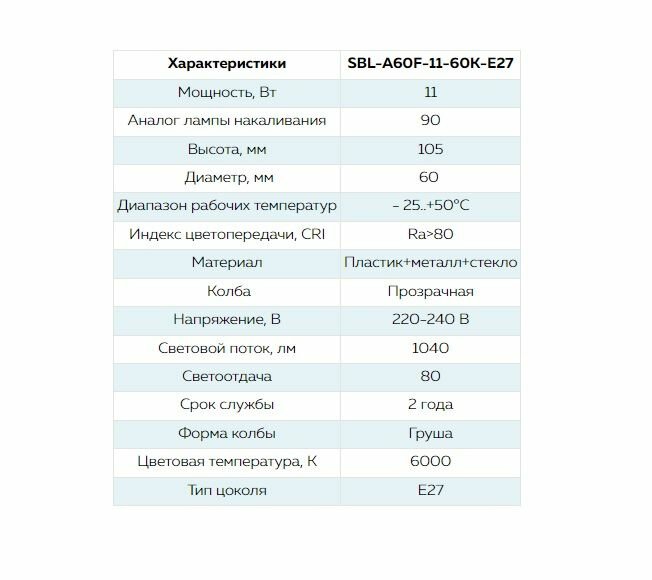 Светодиодная лампа FIL E27 11Вт (SBL-A60F-11-60K-E27) холодный дневной, упаковка 5 шт. информация: