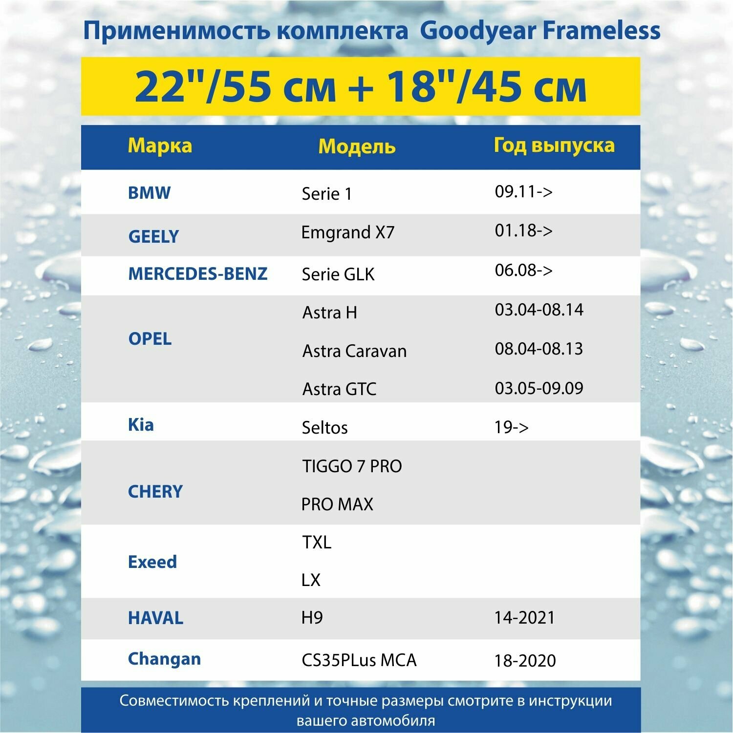 2 Щетки стеклоочистителя в комплекте (55+45 см), Дворники для автомобиля GOODYEAR для OPEL Astra H (04-14), Chery Tiggo 7 Pro / Чери Тигго 7 Про, Kia Seltos (19-н. в.) информация: