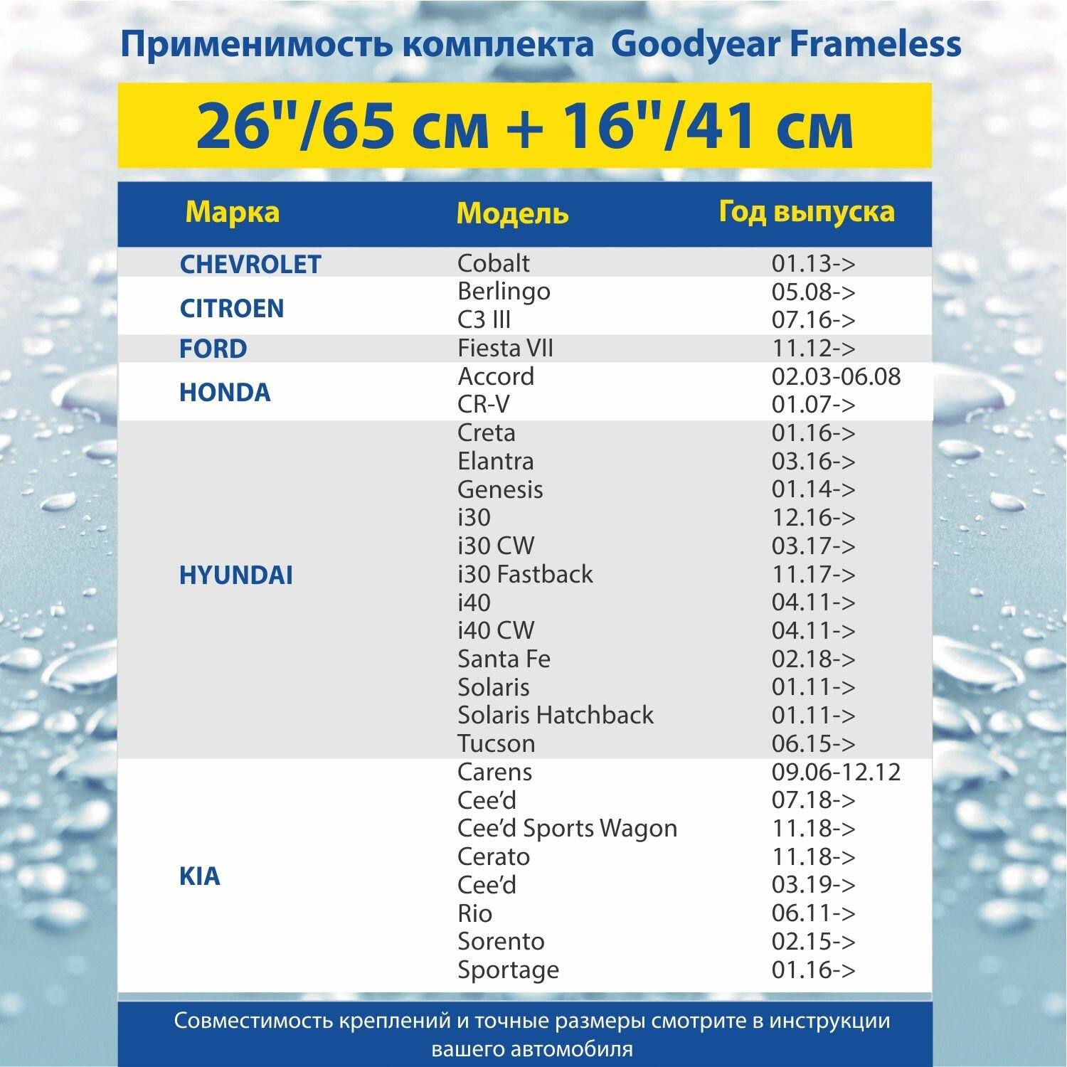 2 Щетки стеклоочистителя в комплекте (65+41 см), Дворники для автомобиля GOODYEAR для HYUNDAI Solaris(-17), TOYOTA RAV4(12-нв), MAZDA 3(18-нв) информация:
