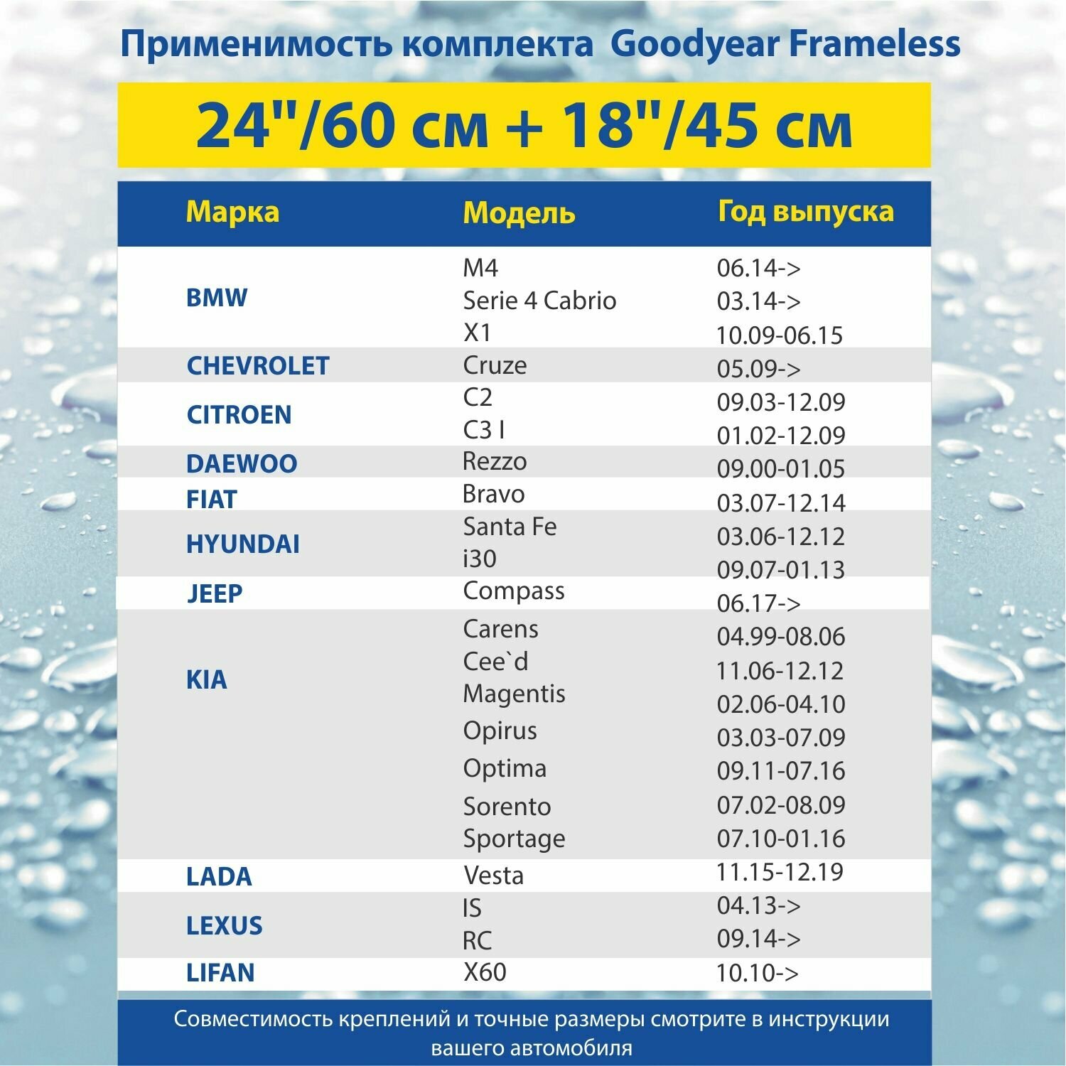 2 Щетки стеклоочистителя в комплекте (60+45 см), Дворники для автомобиля GOODYEAR для LADA Vesta(-19), HYUNDAI Santa Fe(06-12), MAZDA 3(13-18) информация: