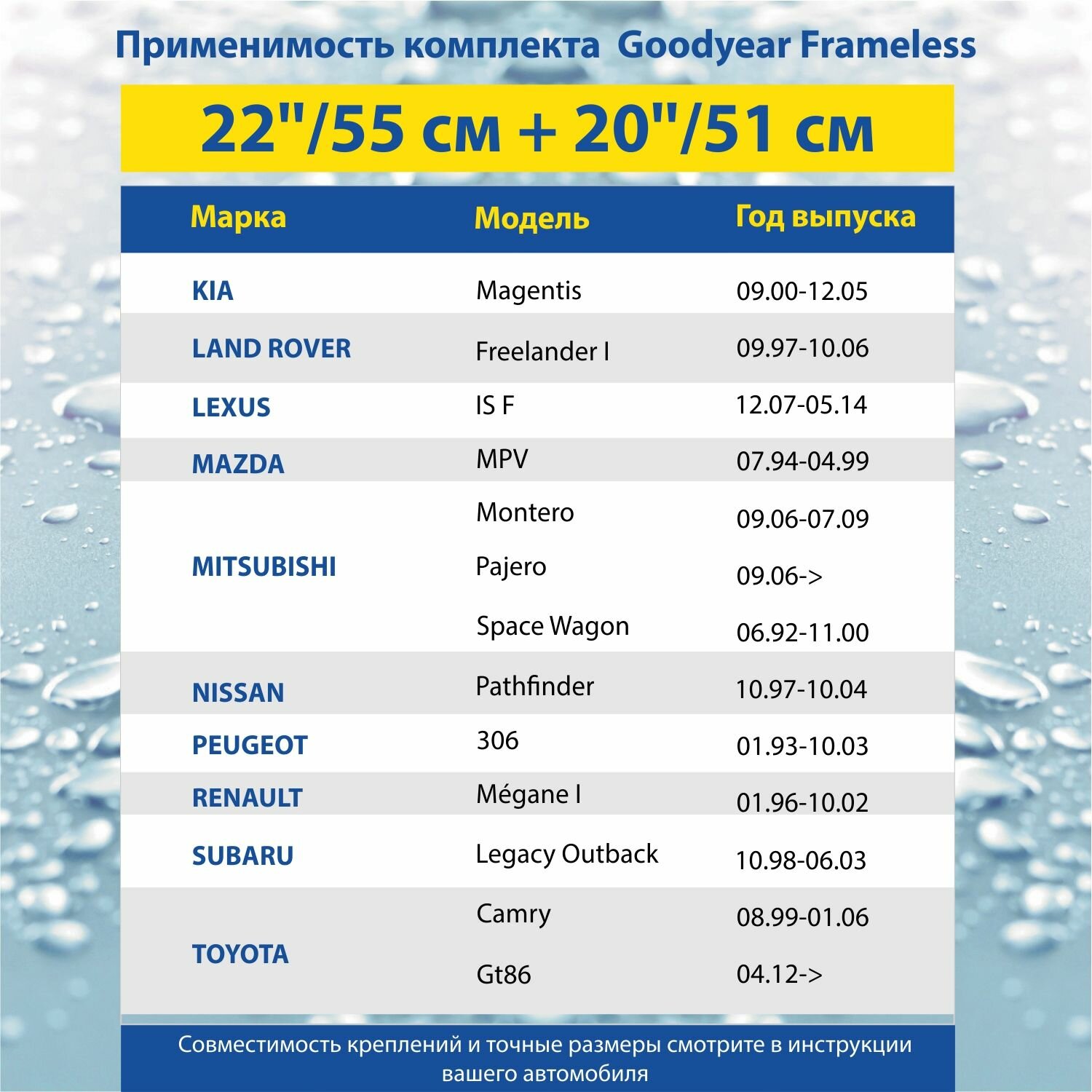 2 Щетки стеклоочистителя в комплекте (55+51 см), Дворники для автомобиля GOODYEAR для TOYOTA Camry(-06), FORD Mondeo(-07), MITSUBISHI PajeroIV информация: