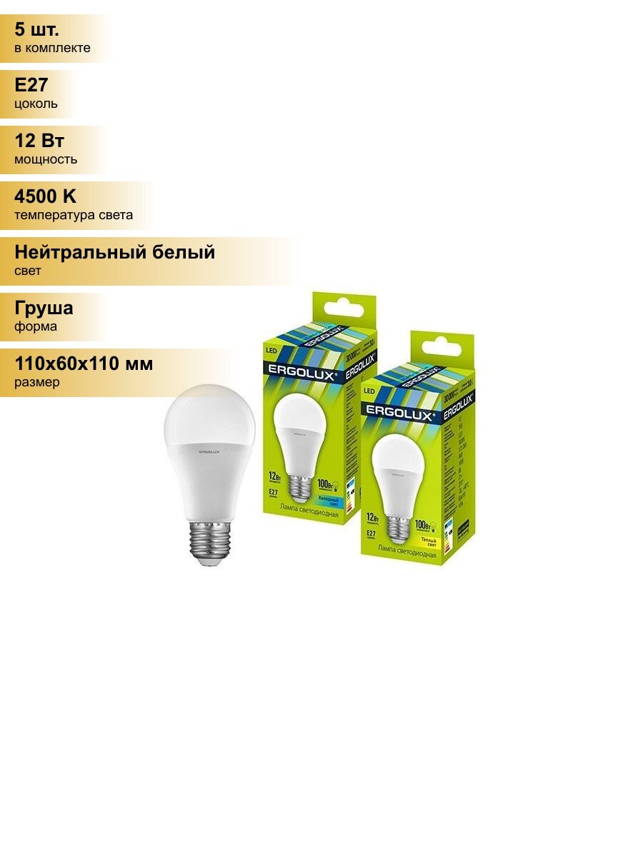 (5 шт.) Светодиодная лампочка Ergolux ЛОН A60 E27 12W(1100lm 270°) 4500K 4K матовая 110x60 пластик/алюм. LED-A60-12W-E27-4K Нейтральный белый. Цоколь E27 информация: