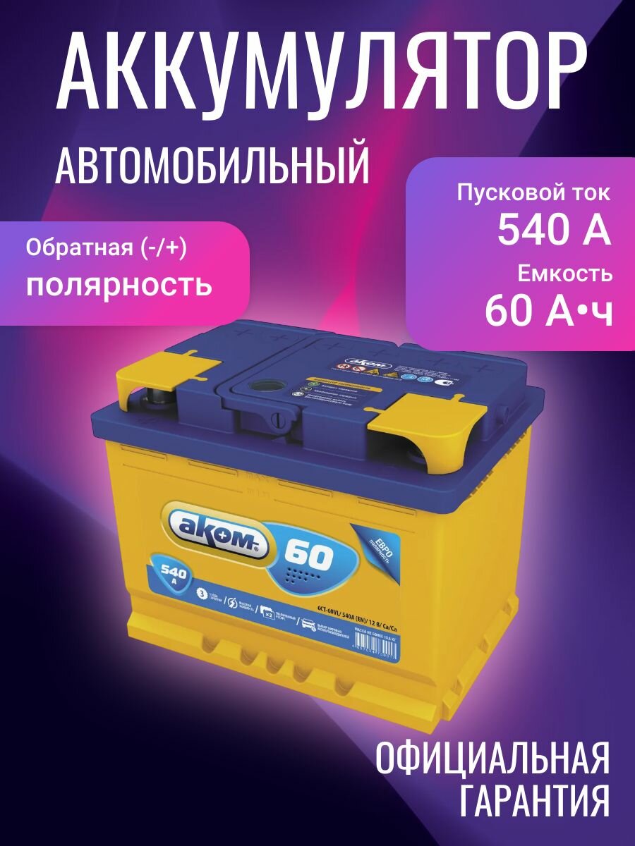10 цен на Аккумулятор автомобильный АКОМ 60 R+ 12В 60Ач 540А