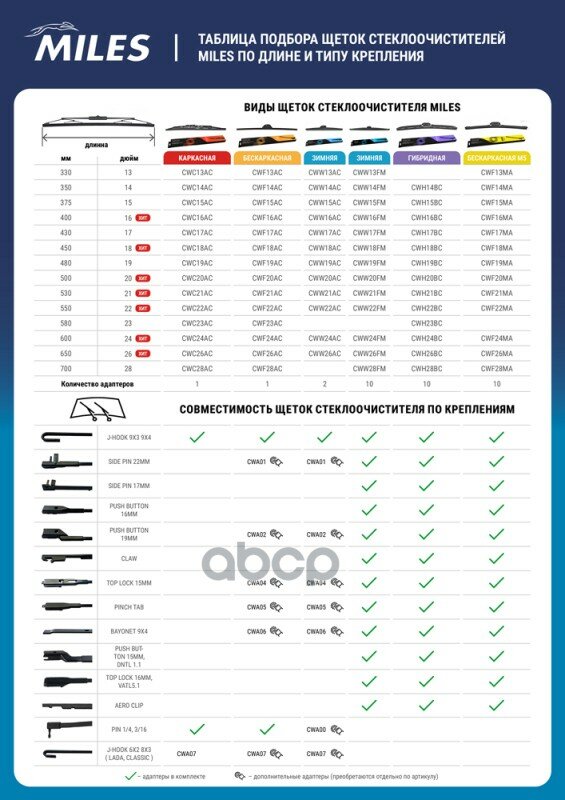MILES Щетка стеклоочистителя бескаркасная 650 мм (26 дюймов) (адаптеры HOOK 9x3/9x4) CWF26AC
