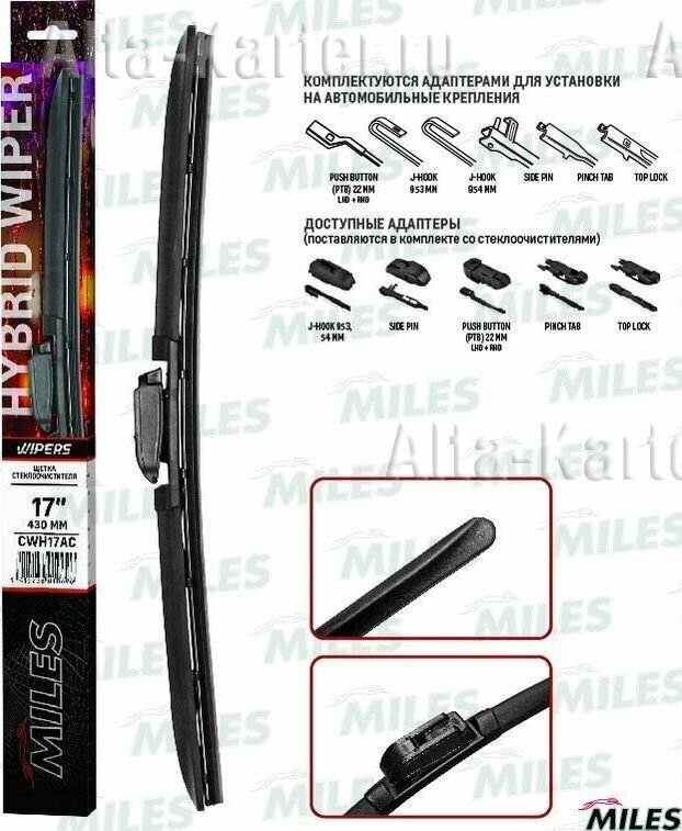 CWH17AC MILES Щетка стеклоочистителя гибридная 430мм (HOOK 9x3/9x4)/адаптер Side PIN/Push Button/Pinch Tab