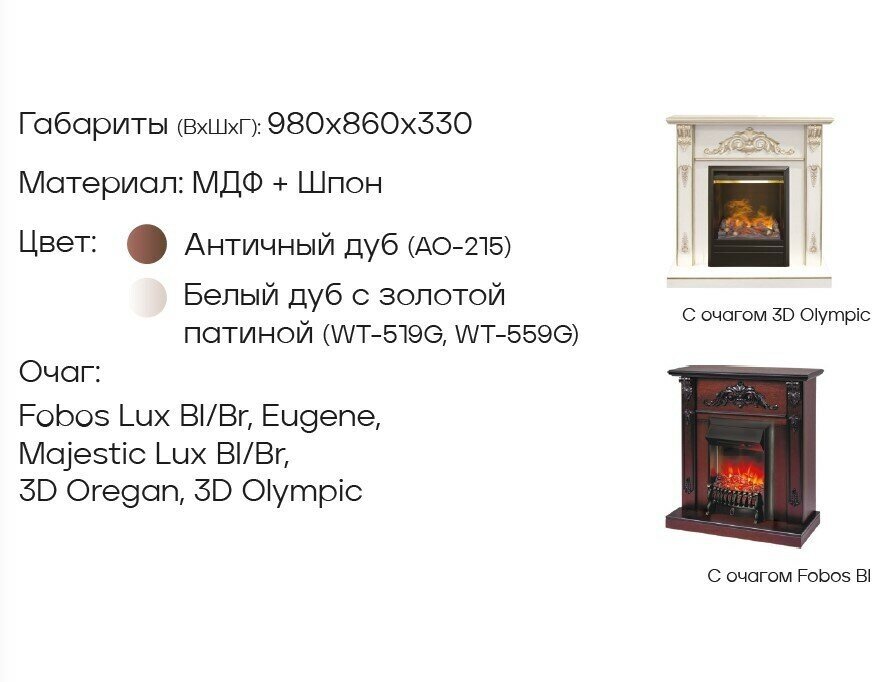 Электрокамин RealFlame Anita WT с 3D Olympic, имитация живого пламени 3D, увлажнение, пульт ДУ, обогрев, информация: