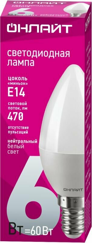 Светодиодная лампа свеча онлайт 71 629 OLL-C37-6-230-4K-E14-FR, цена за 1 шт.