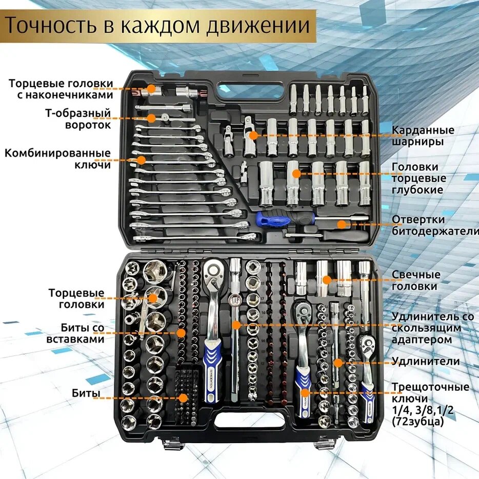 10 цен на Набор инструментов 219 предметов, 1/4", 3/8", 1/2", профессиональный