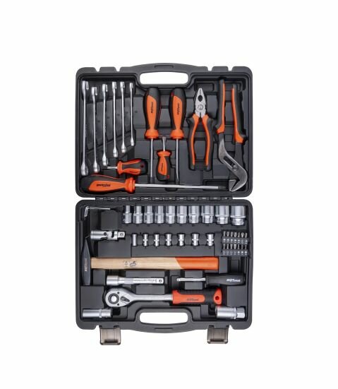 | Инструменты в комплекте | молоток / отвёртки / рукоять для бит / трещотка / пассатижи / ключи гаечные / клещи переставные / ключи имбусовые (шестигранные) |